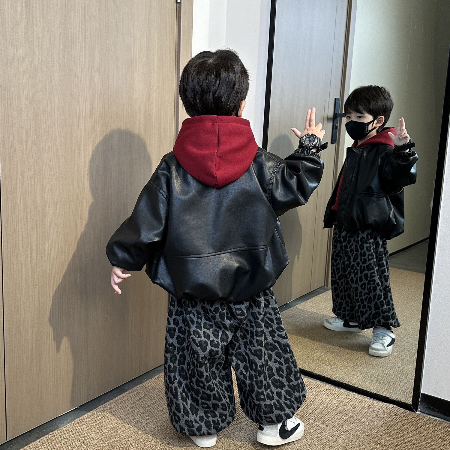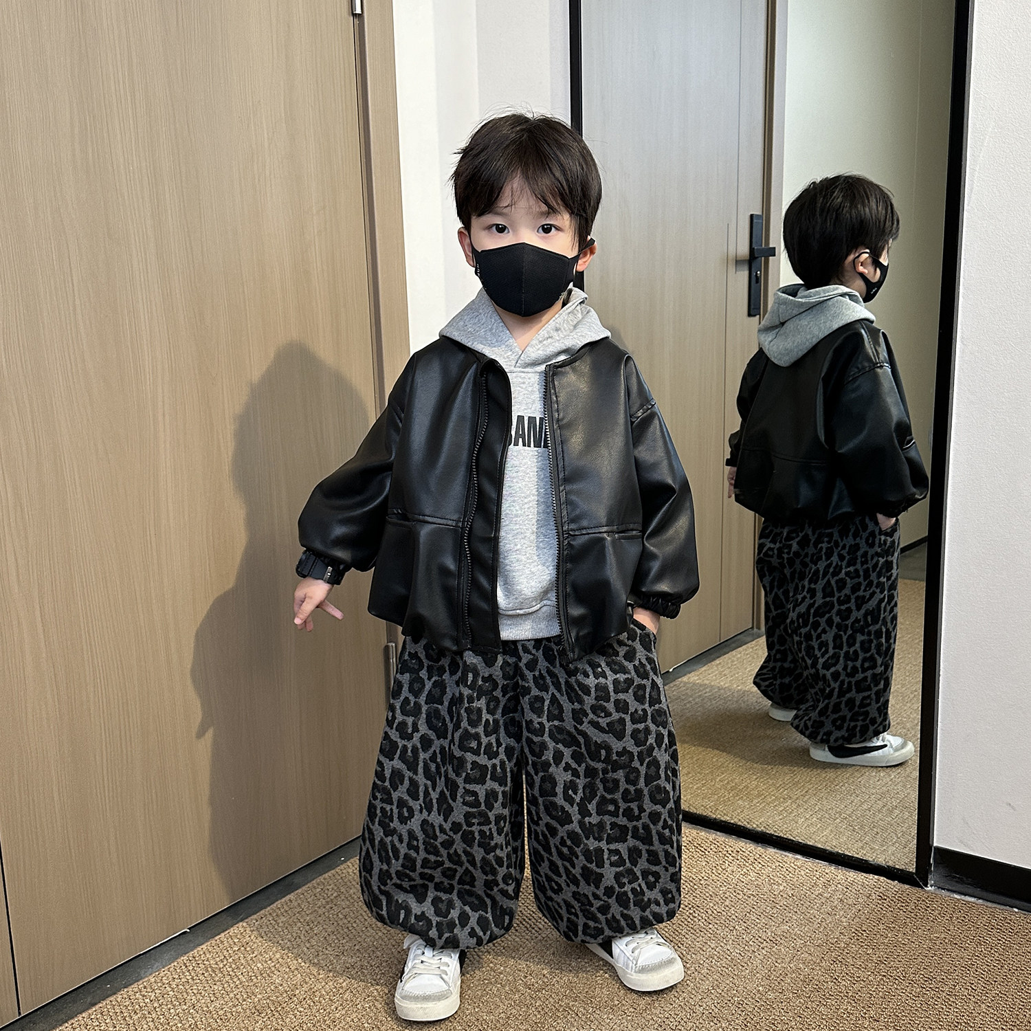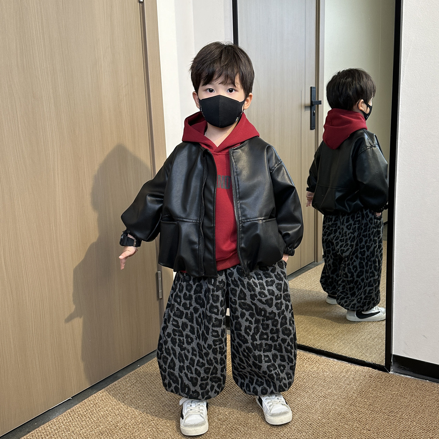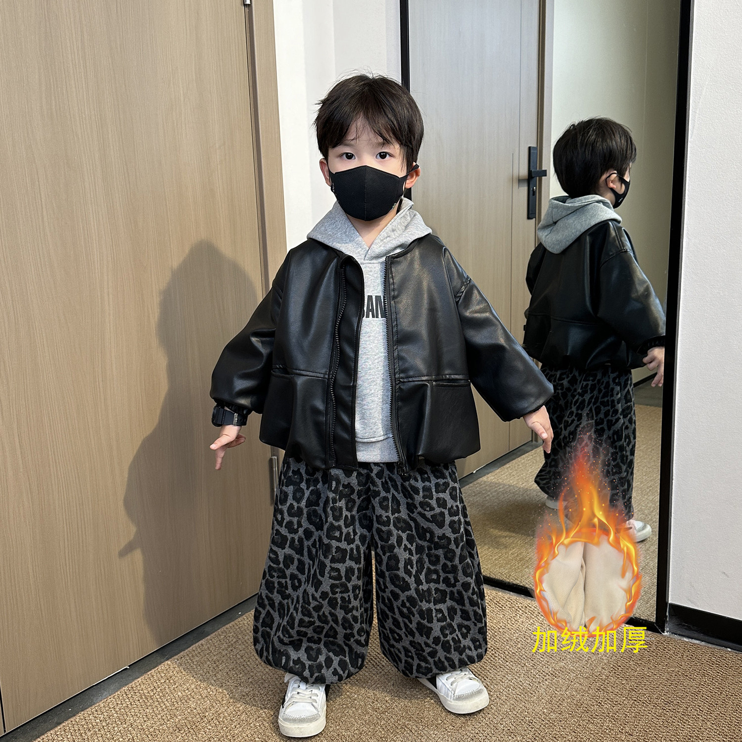 男童春装套装2026新款秋冬装帅气男孩时髦儿童加绒卫衣皮衣三件套