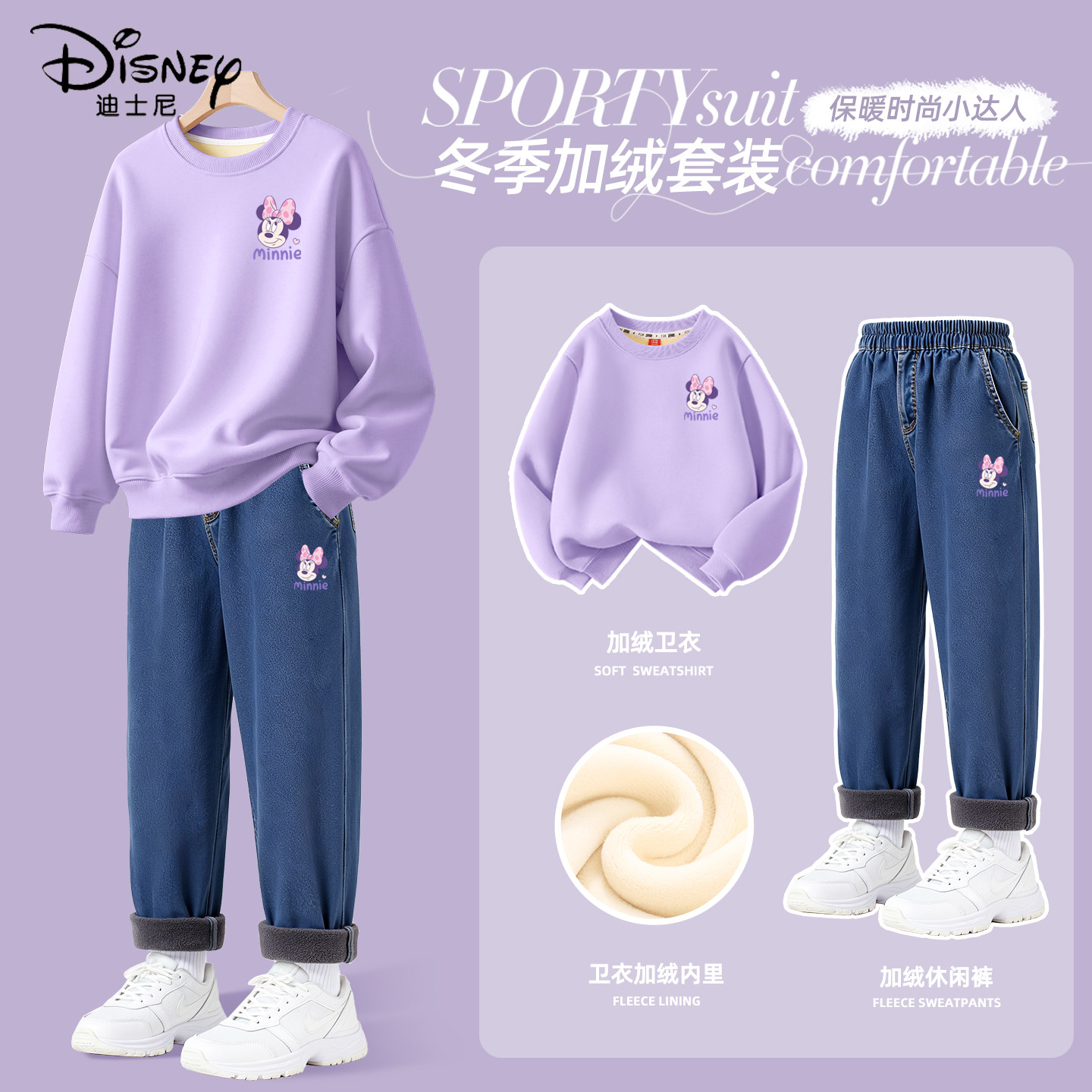 迪士尼女童加绒套装大童女孩2025新款一体绒紫色保暖卫衣儿童冬装
