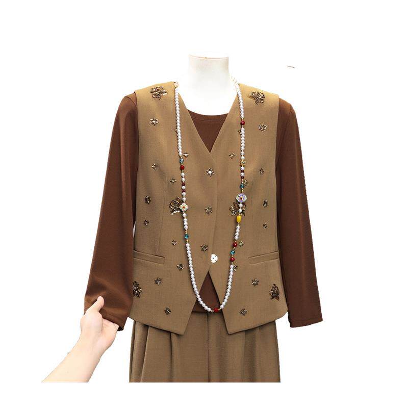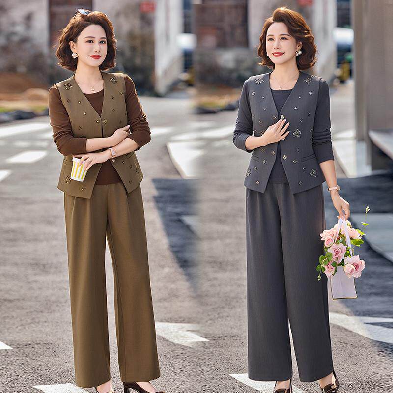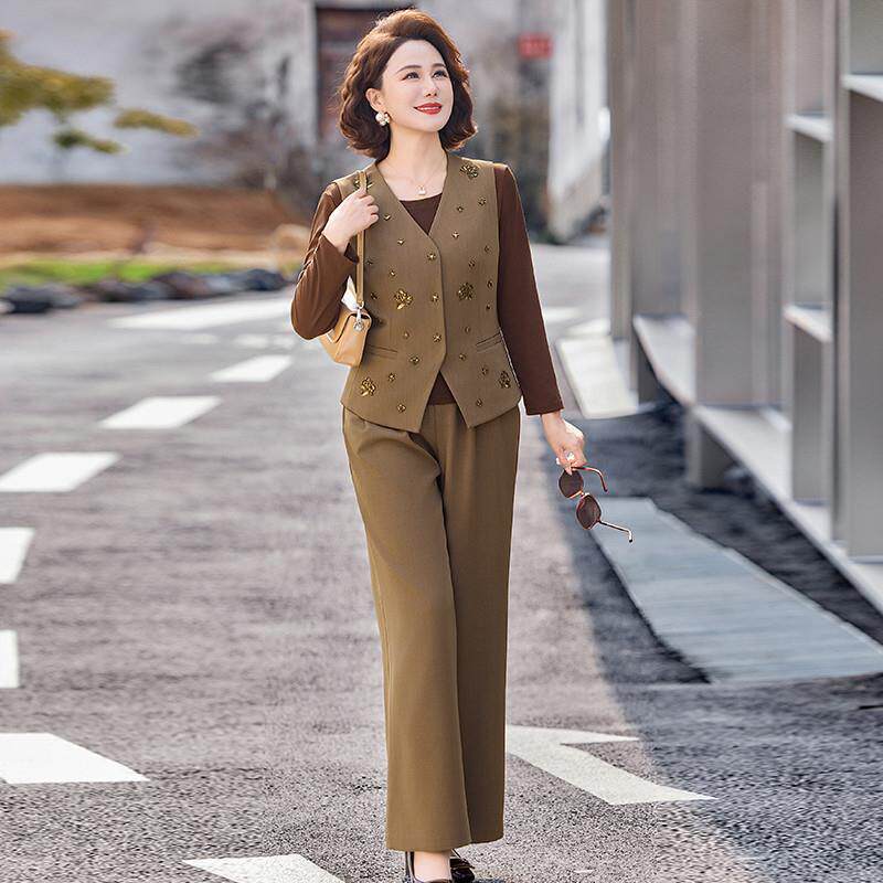 时尚妈妈春装三件套洋气质中老年女装减龄高级小众设计感纽扣套装