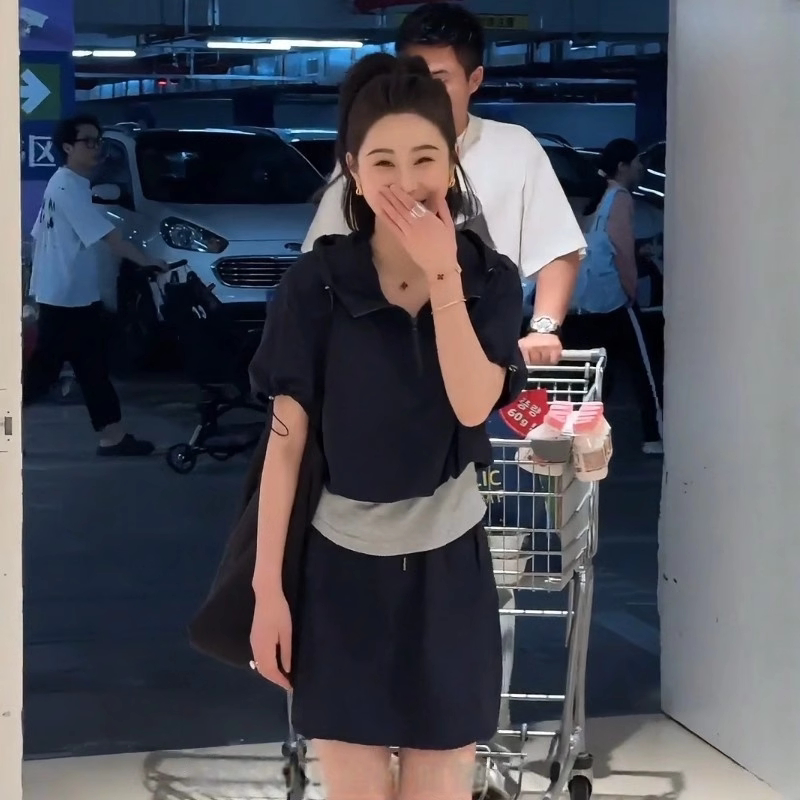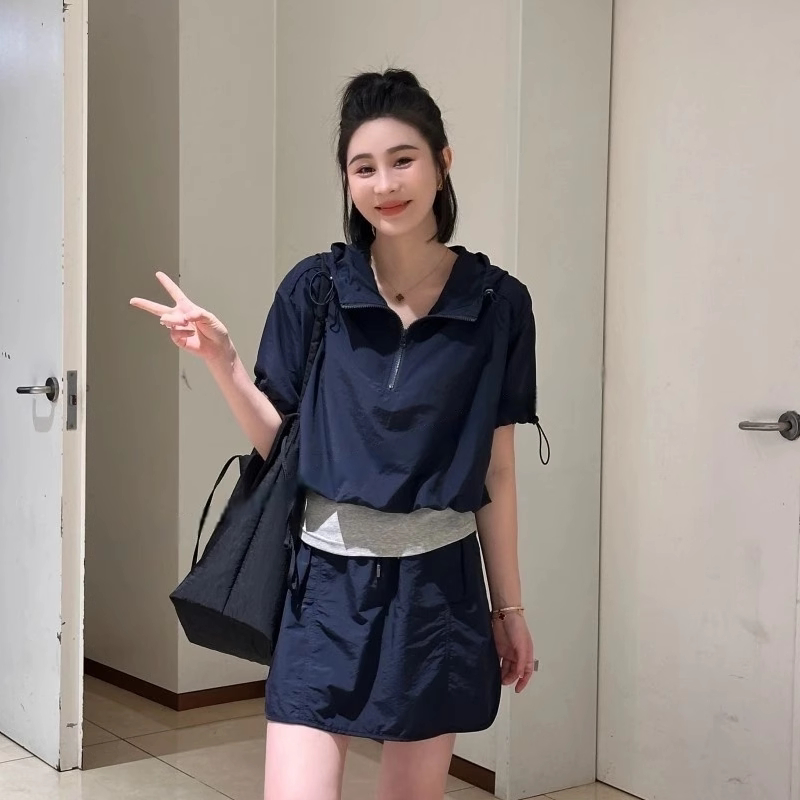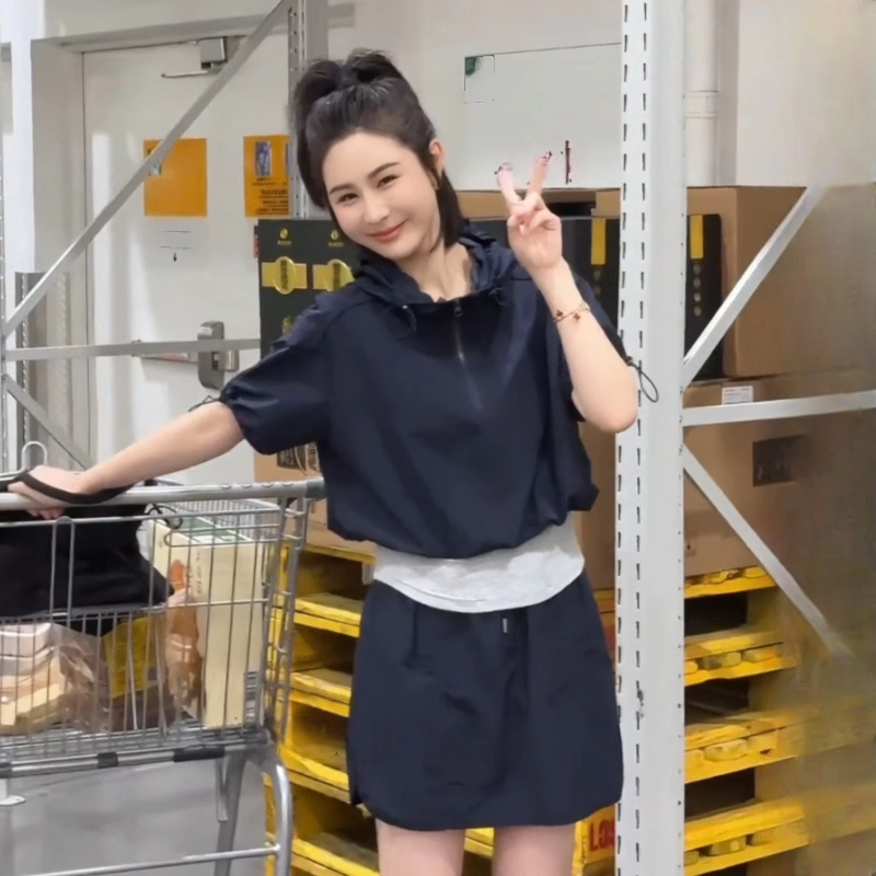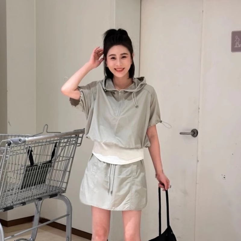 假两件短袖抽绳薄款上衣女2026新款夏季休闲运动半裙显瘦短款套装