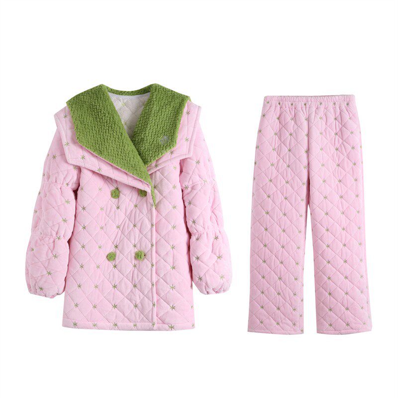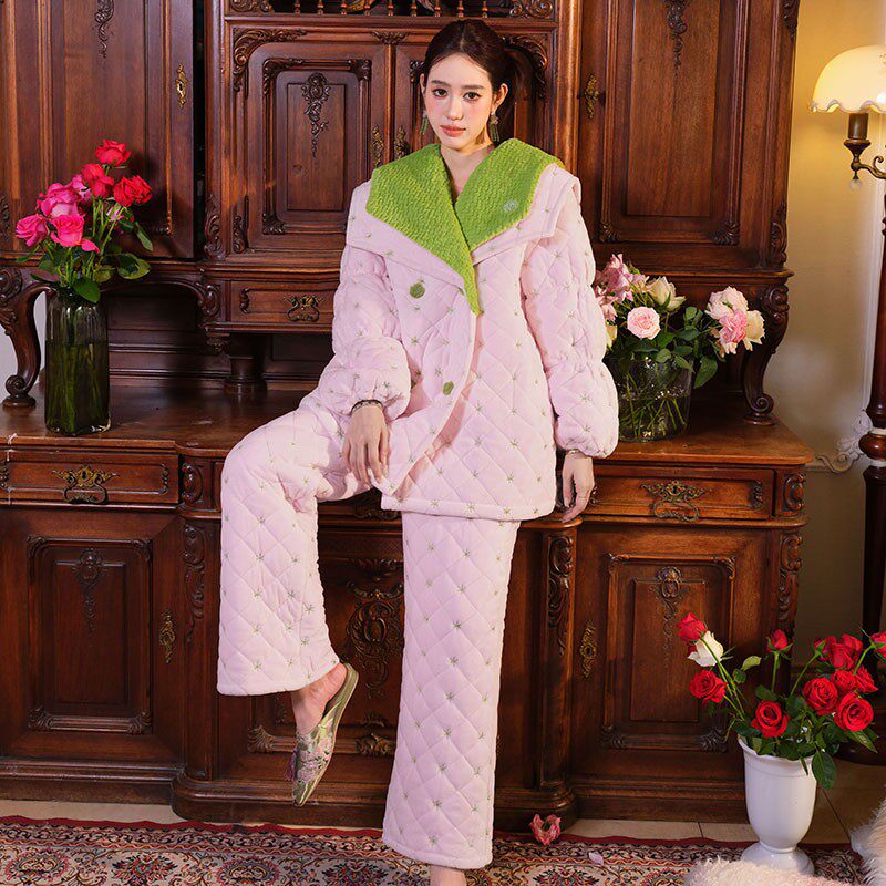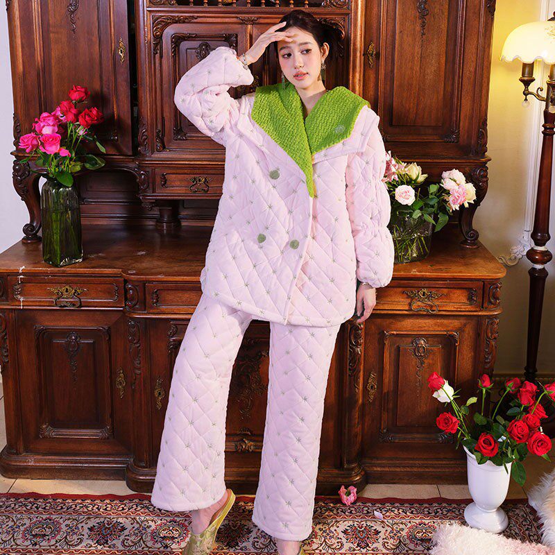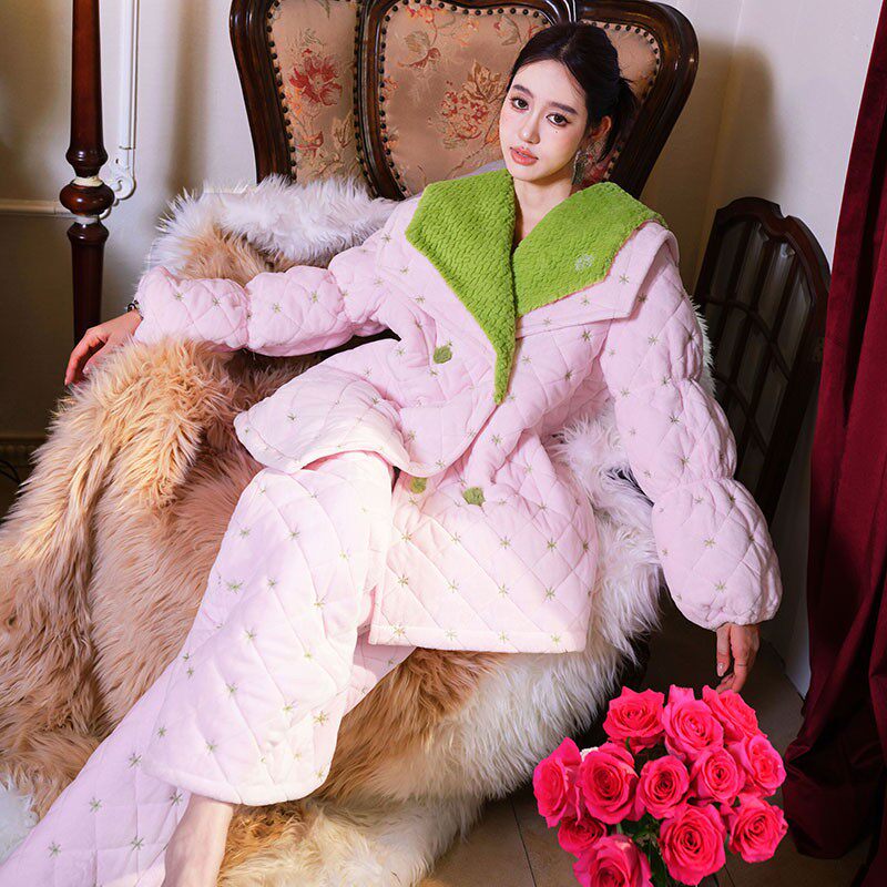 冬季三层夹棉加厚睡衣女毛绒大翻领洋气时尚加绒可外穿家居服套装