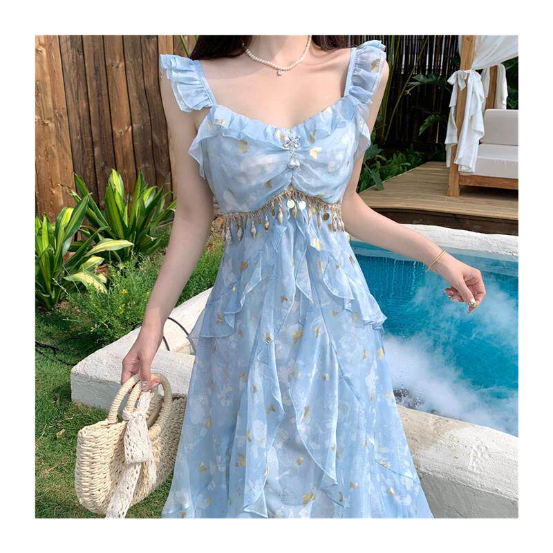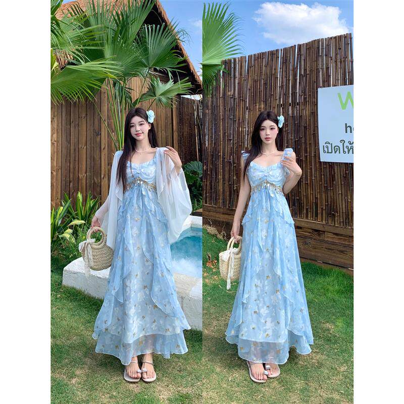 大码胖mm蝴蝶亮片吊带连衣裙女夏季荷叶边裙子外搭长袖开衫两件套