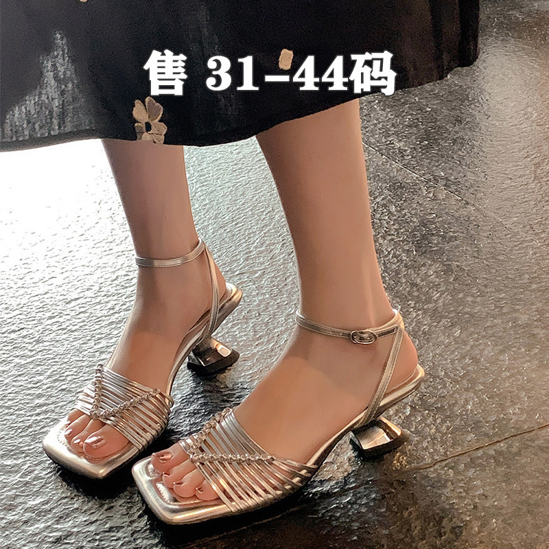 大码女鞋41到43方头高跟小码凉鞋女313233百搭编织夏季真皮凉拖鞋
