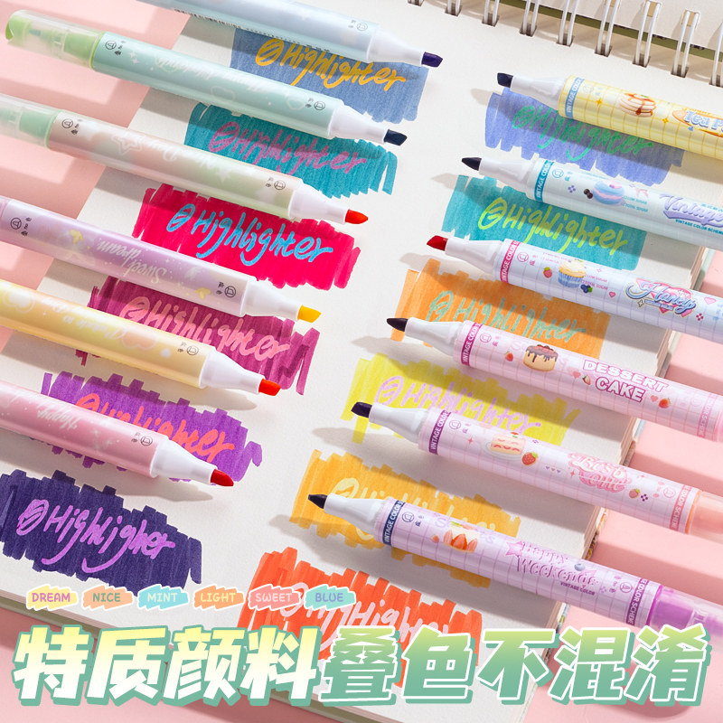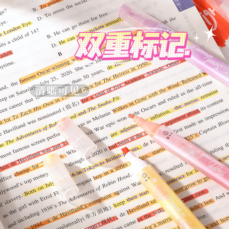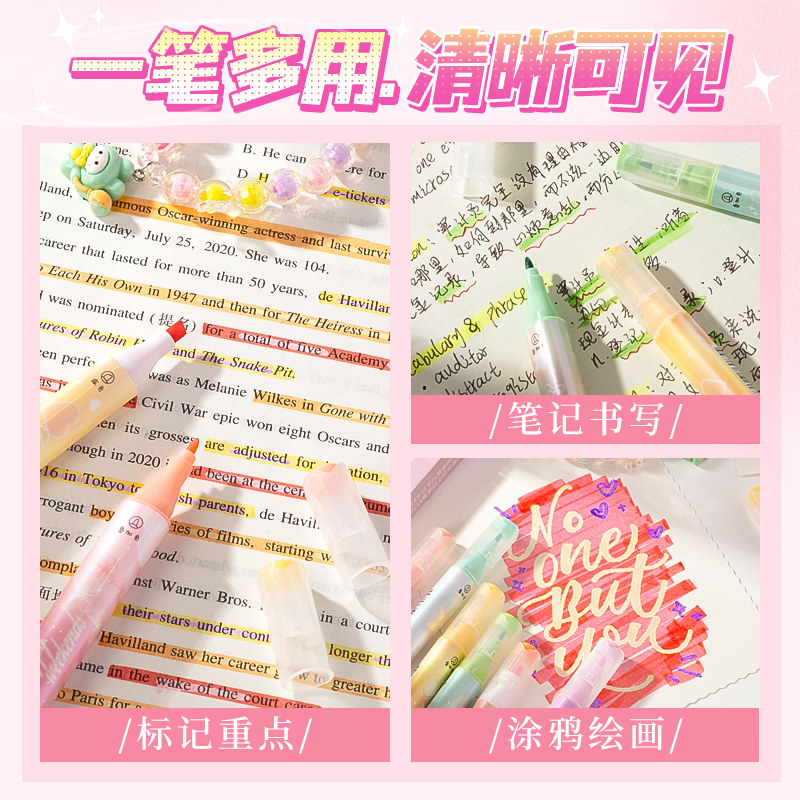 叠色双头荧光笔记号笔高颜值ins风黄色彩色做笔记划重点小学生初中生专用高中生淡色系大容量按动银光萤光笔