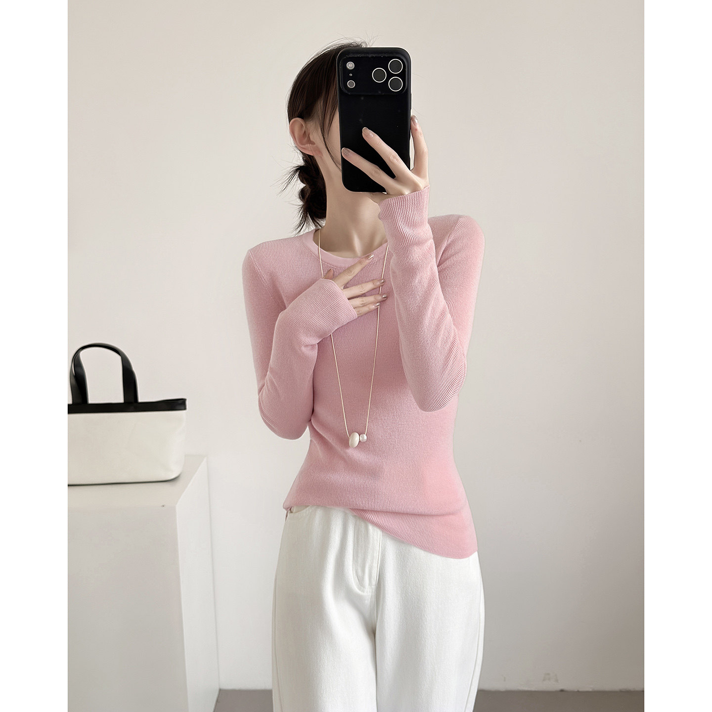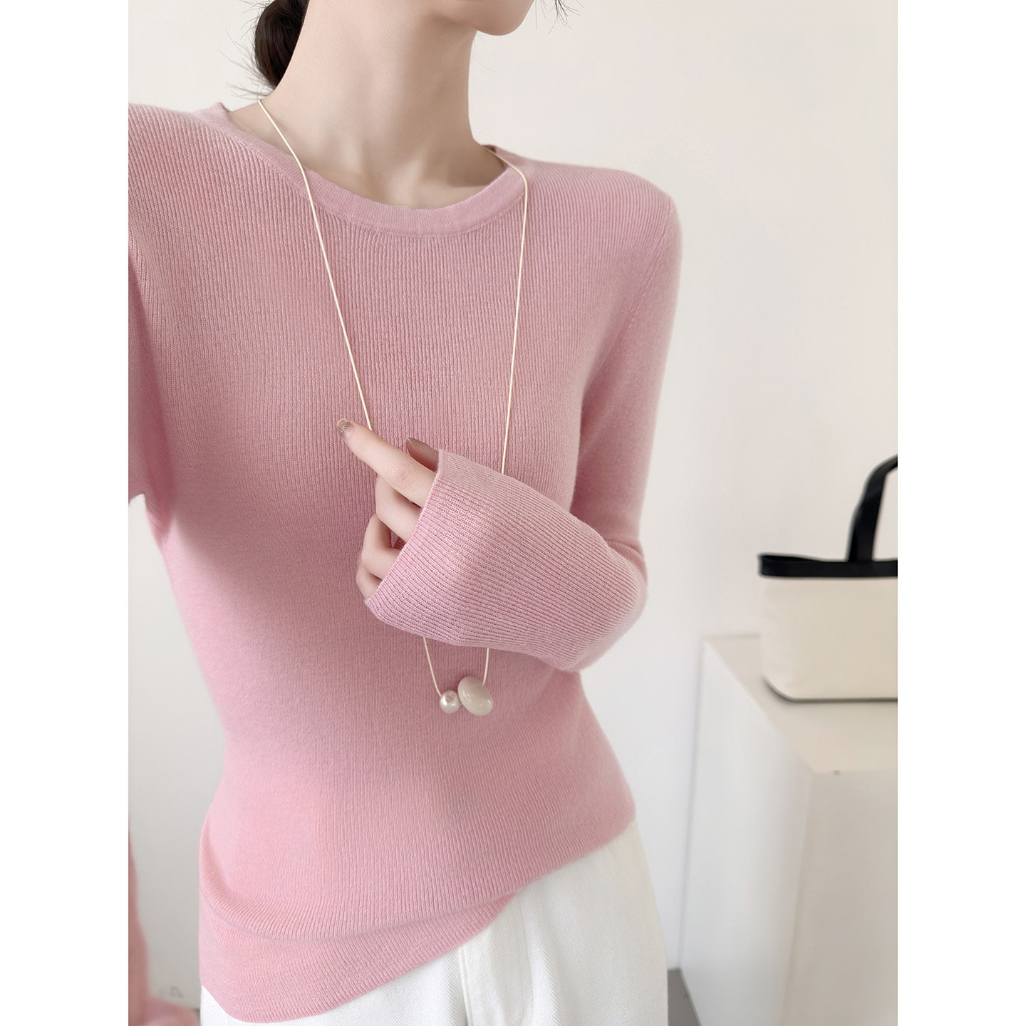 粉色圆领毛衣女款2026新款修身显瘦弹力内搭上衣100纯羊毛打底衫