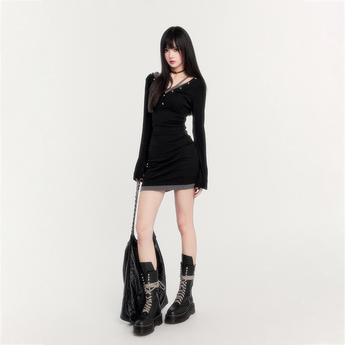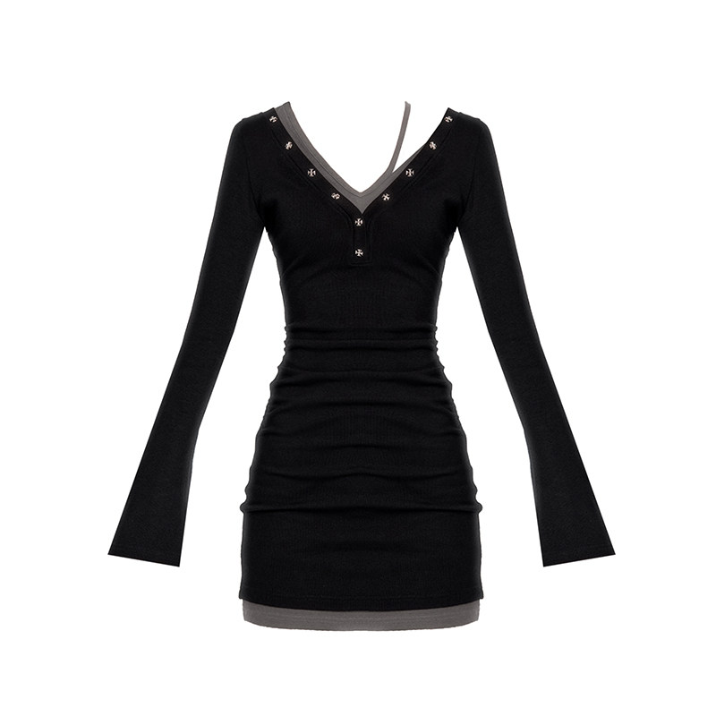 VOCK 调性进阶 假两件V领收腰显瘦长袖包臀内搭打底裙连衣裙辣妹