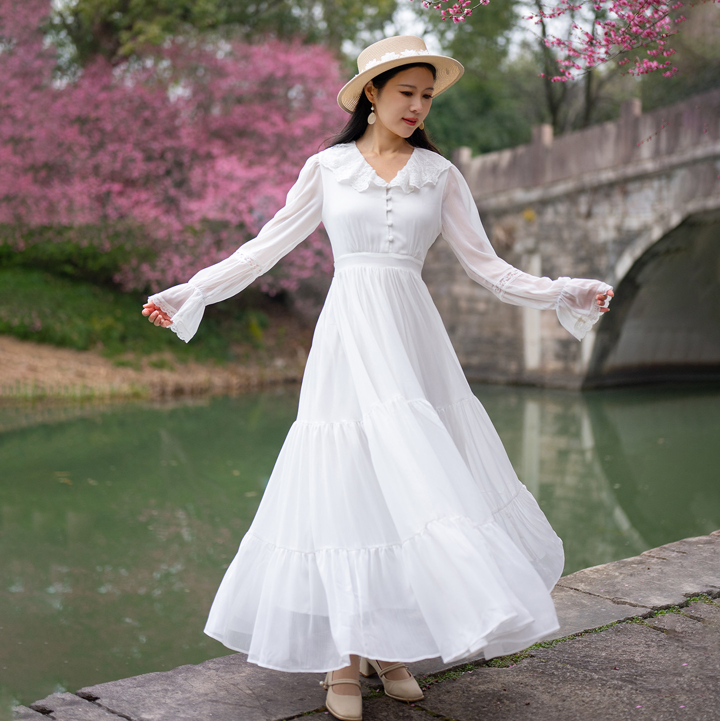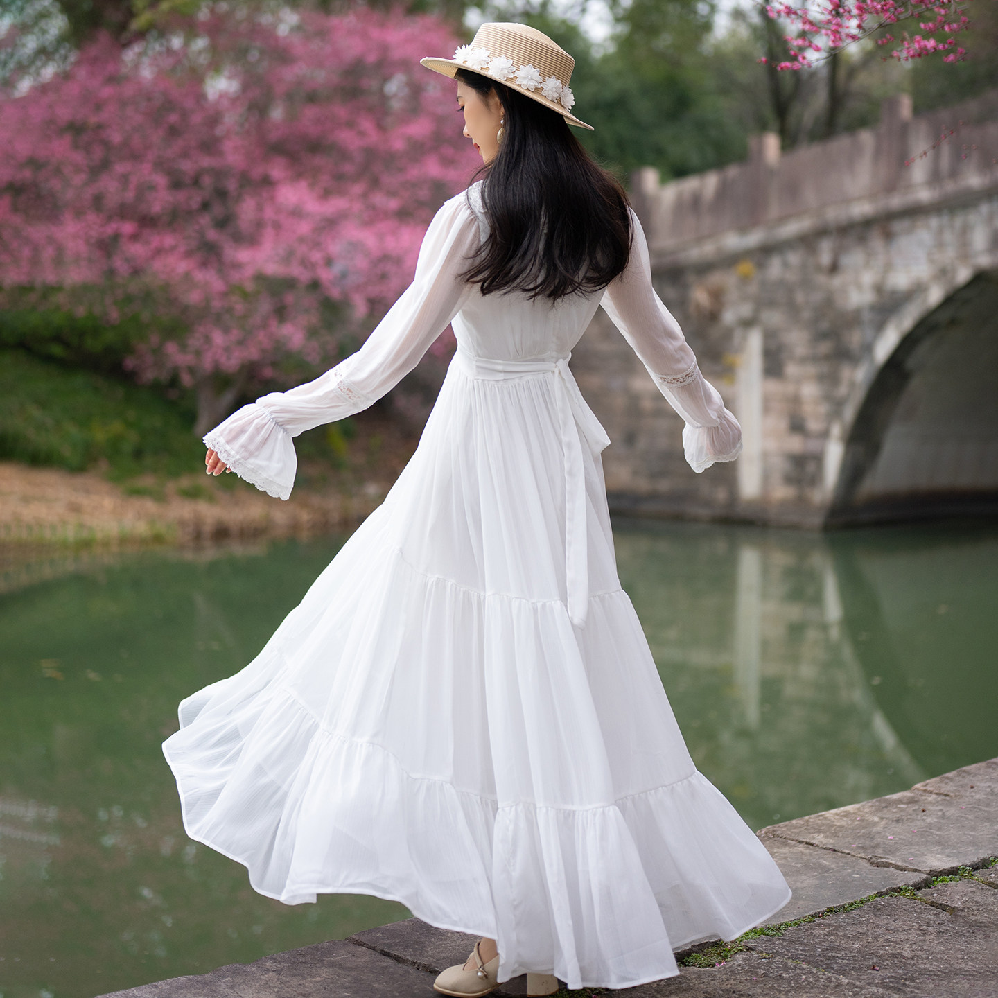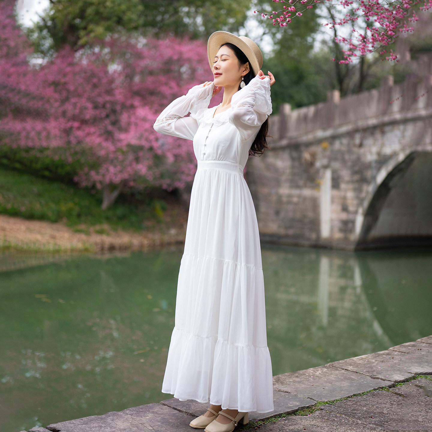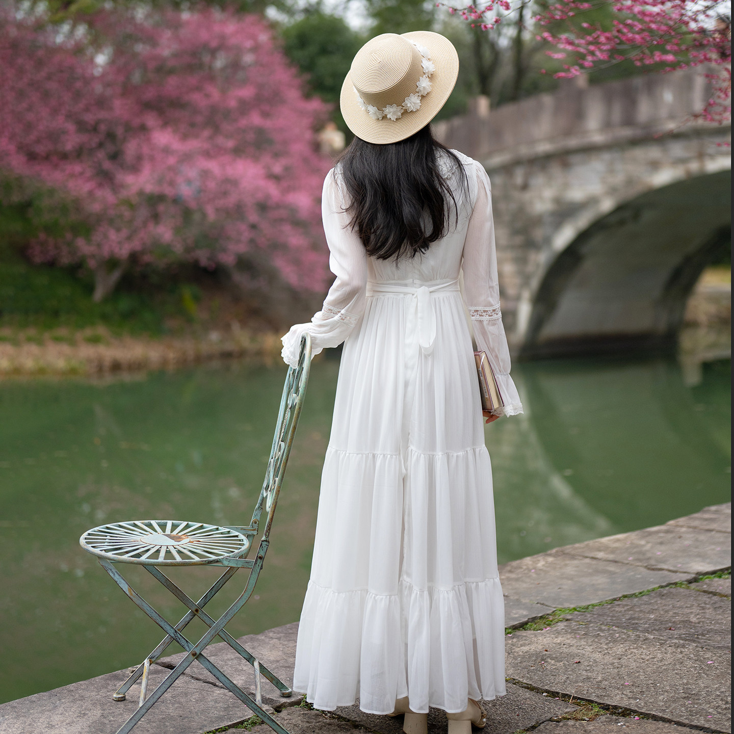 理想三旬女装复古法式白色蕾丝拼接雪纺仙气飘逸连衣裙蛋糕裙长裙