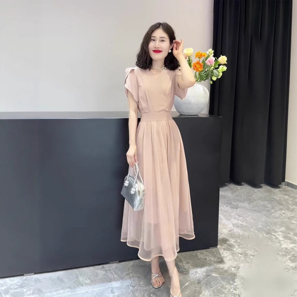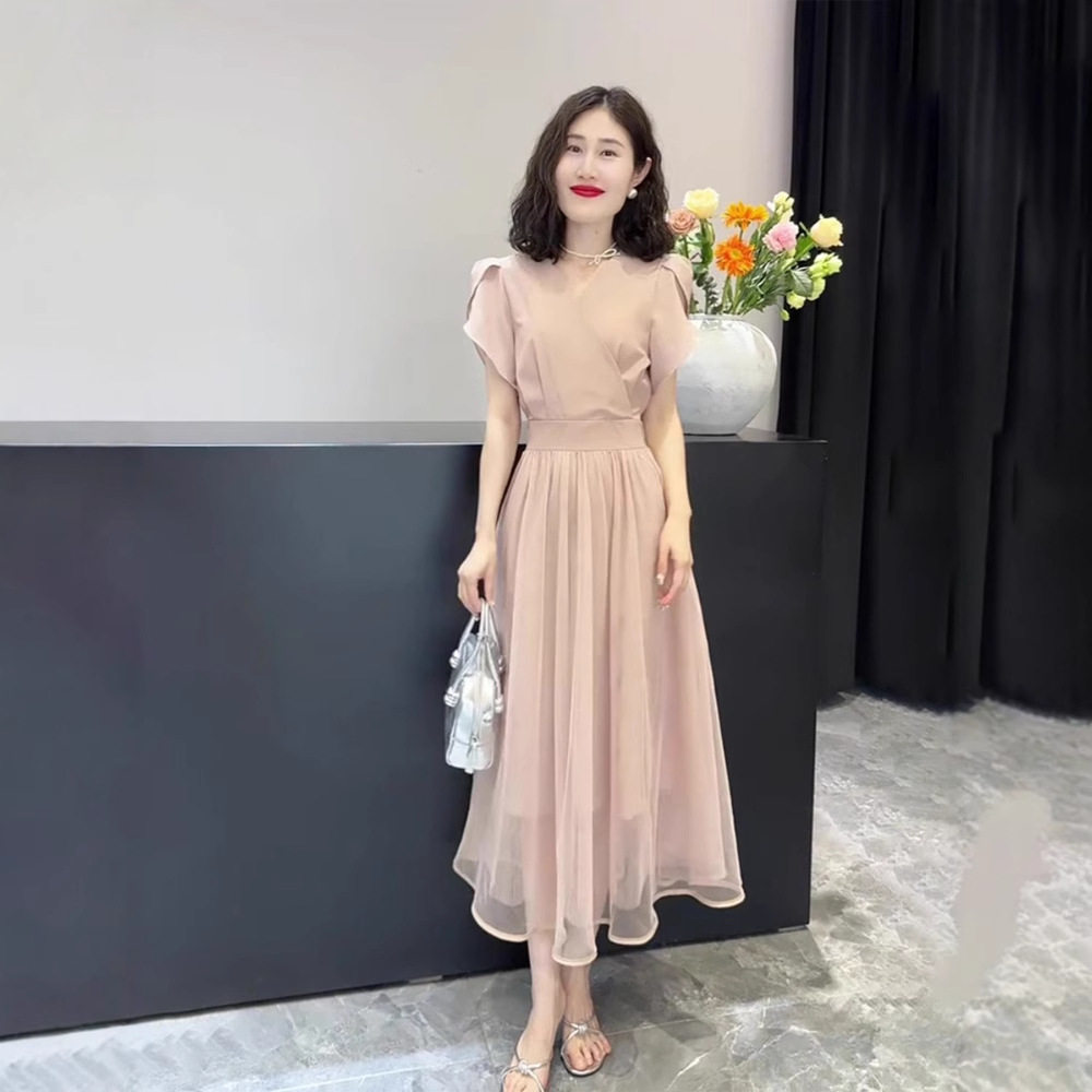 夏季新款轻奢高级感长裙气质名媛浅粉色短袖雪纺连衣裙子女装