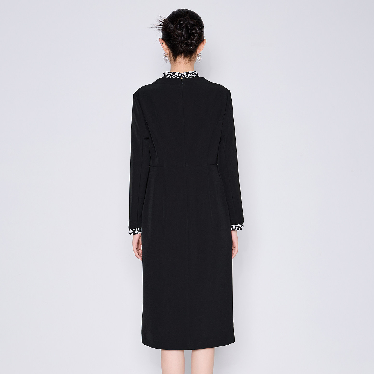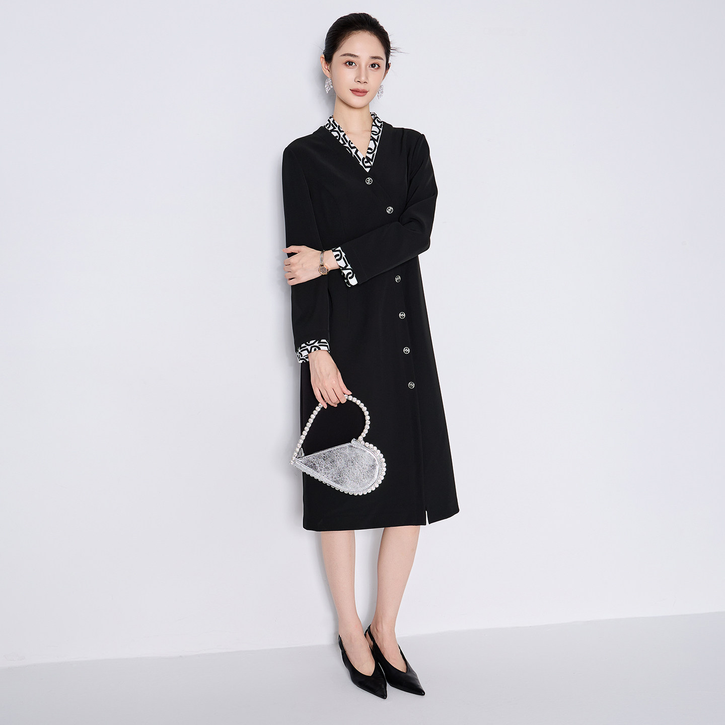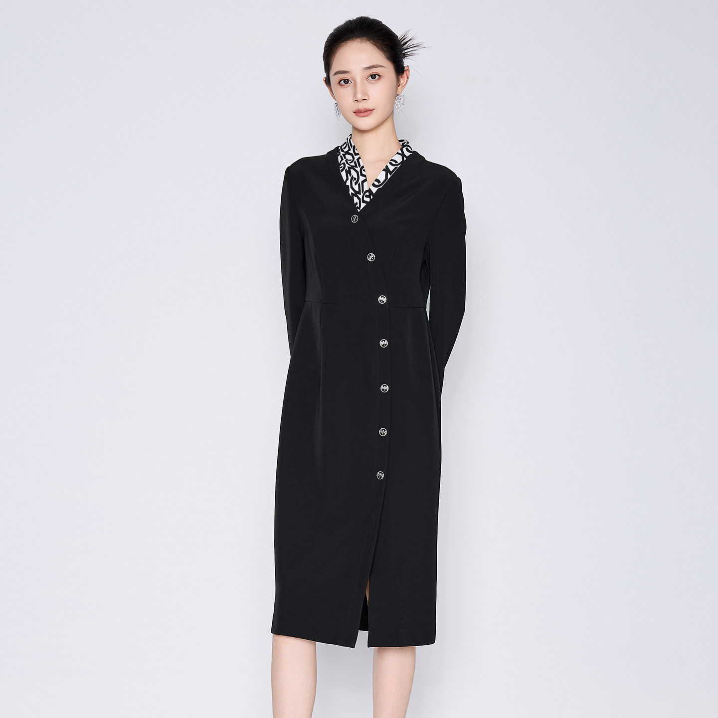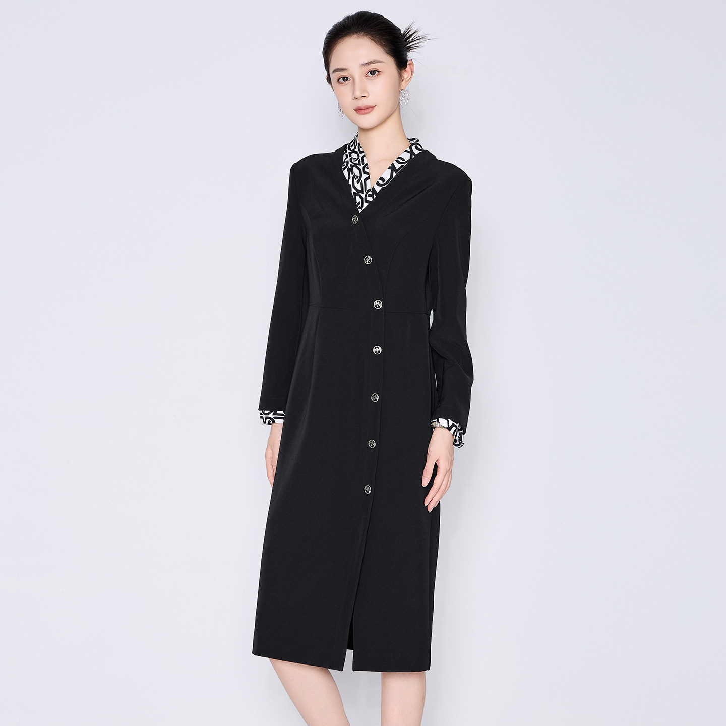311线报网描述:印花拼接V领 精致镂空纽扣 收腰显瘦版型