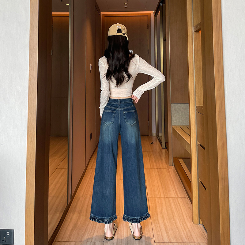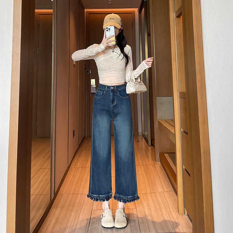 花边阔腿牛仔裤女2026年春夏新款高腰宽松显瘦弹力小个子直筒九分