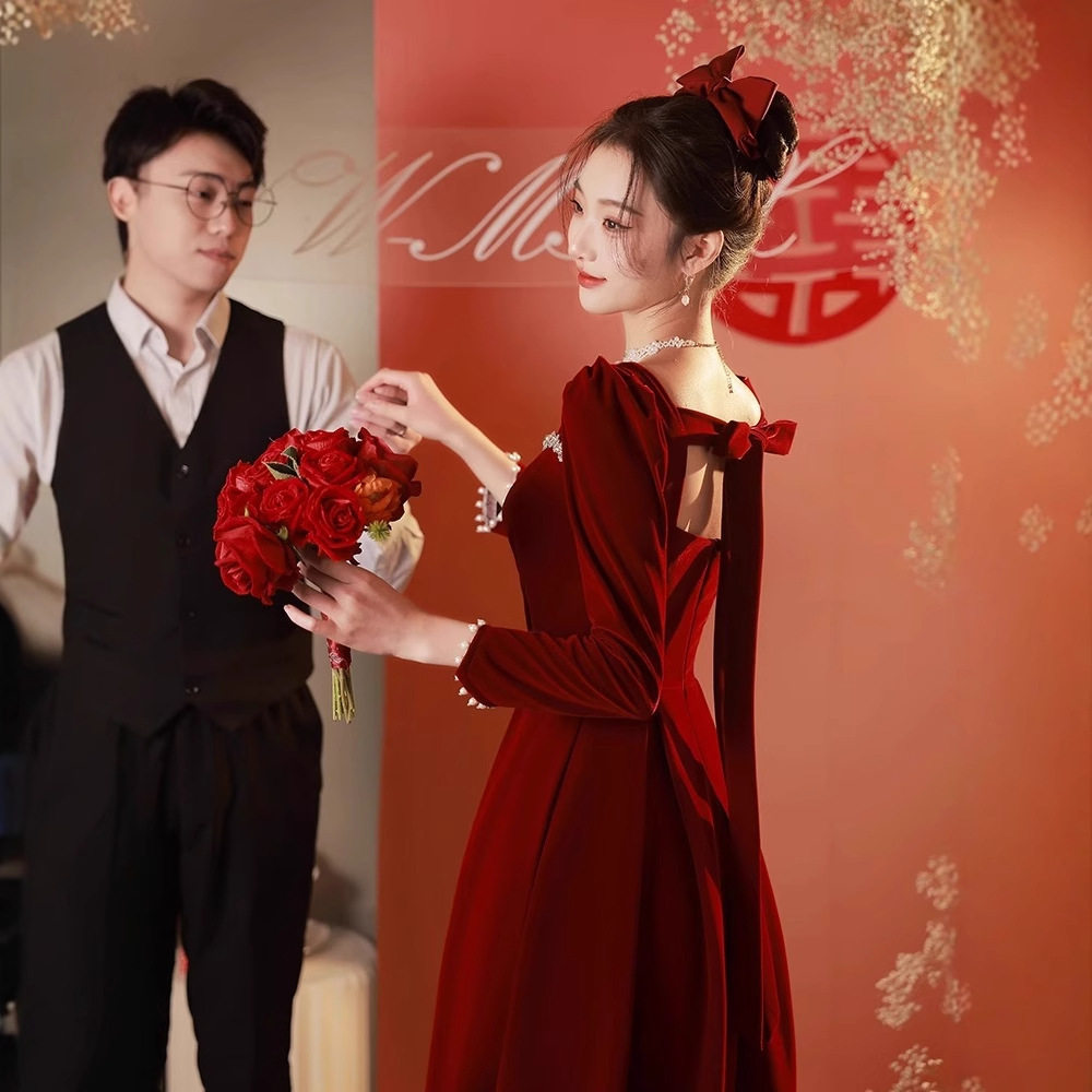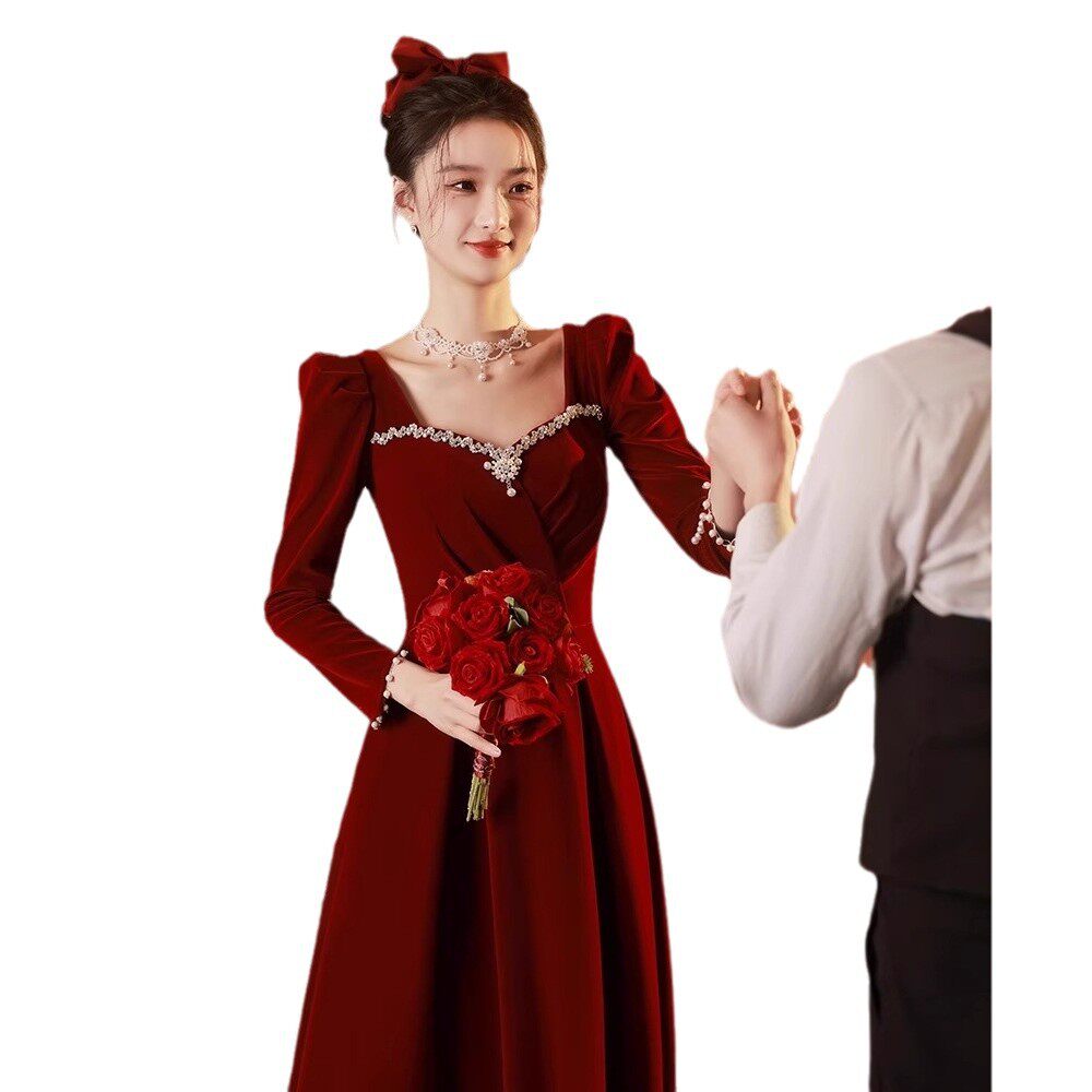 敬酒服新娘晨袍2025新款酒红色订婚连衣裙平时可穿结婚长袖晚礼服