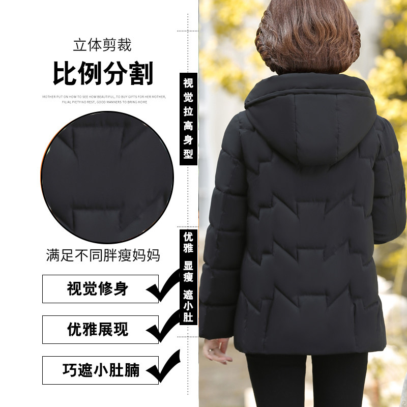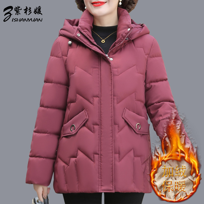秋冬季妈妈加绒加厚保暖洋气棉服时尚气质连帽棉衣外套中老年女装