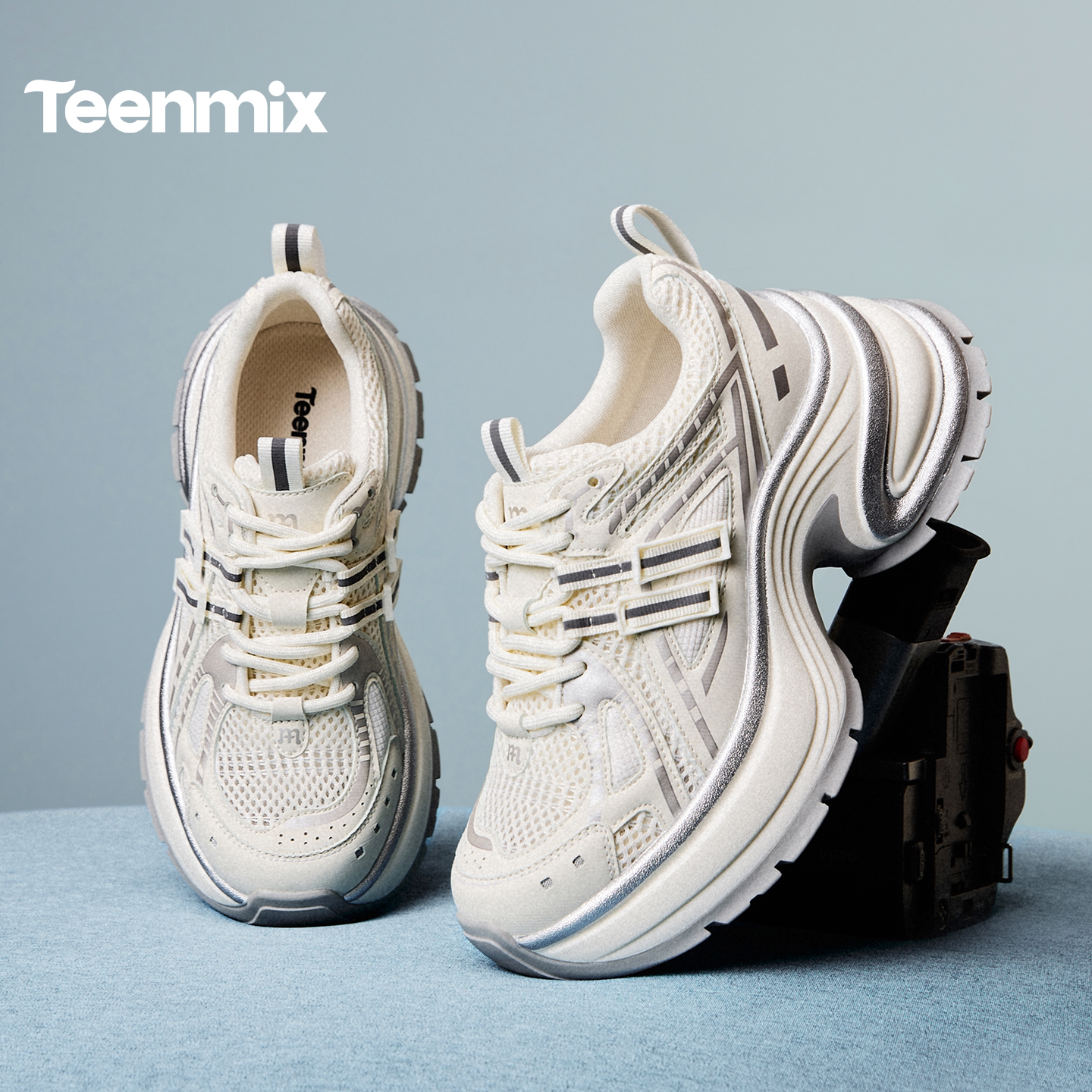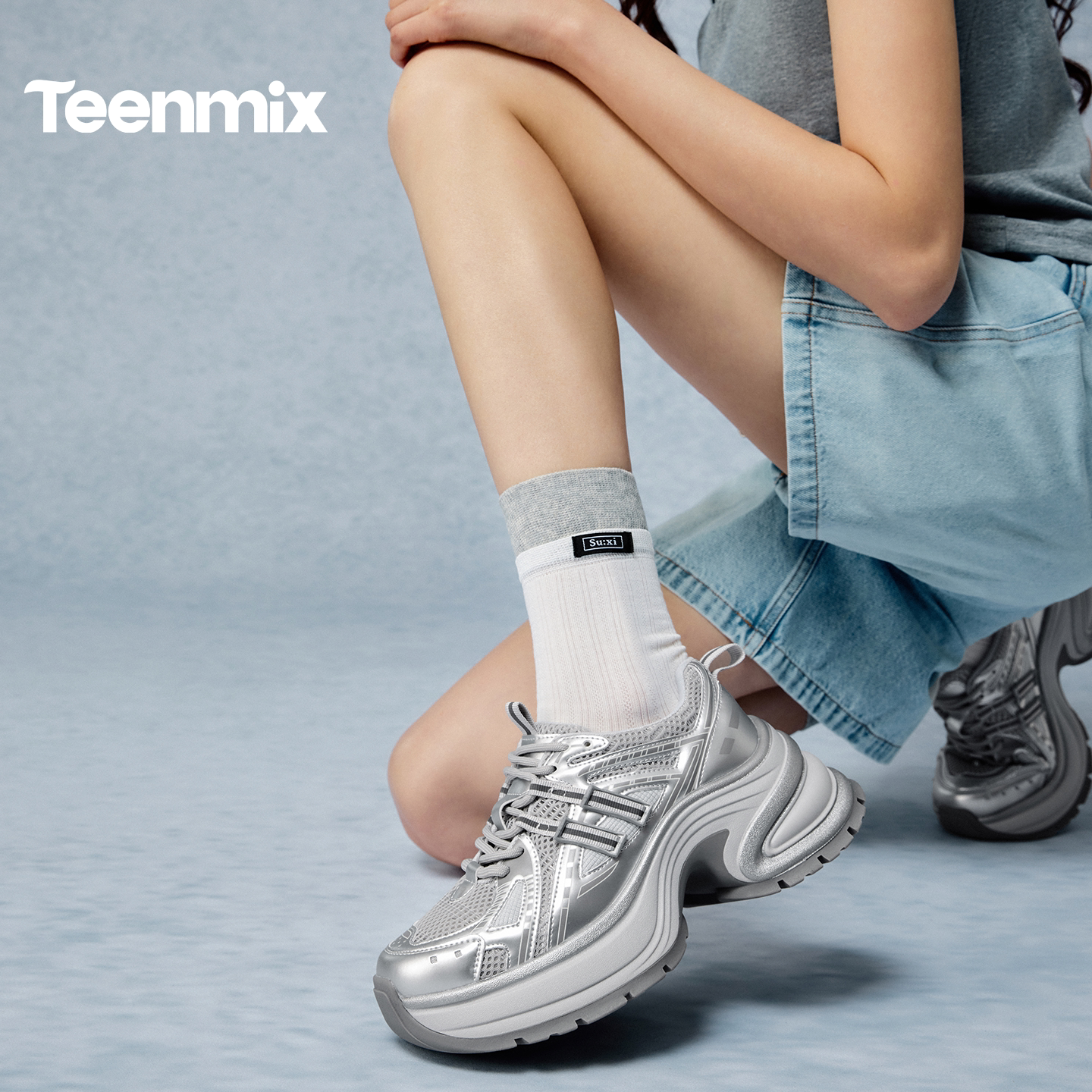 天美意网面透气厚底增高银色老爹鞋女休闲运动鞋小白鞋2026春新款