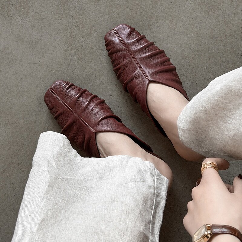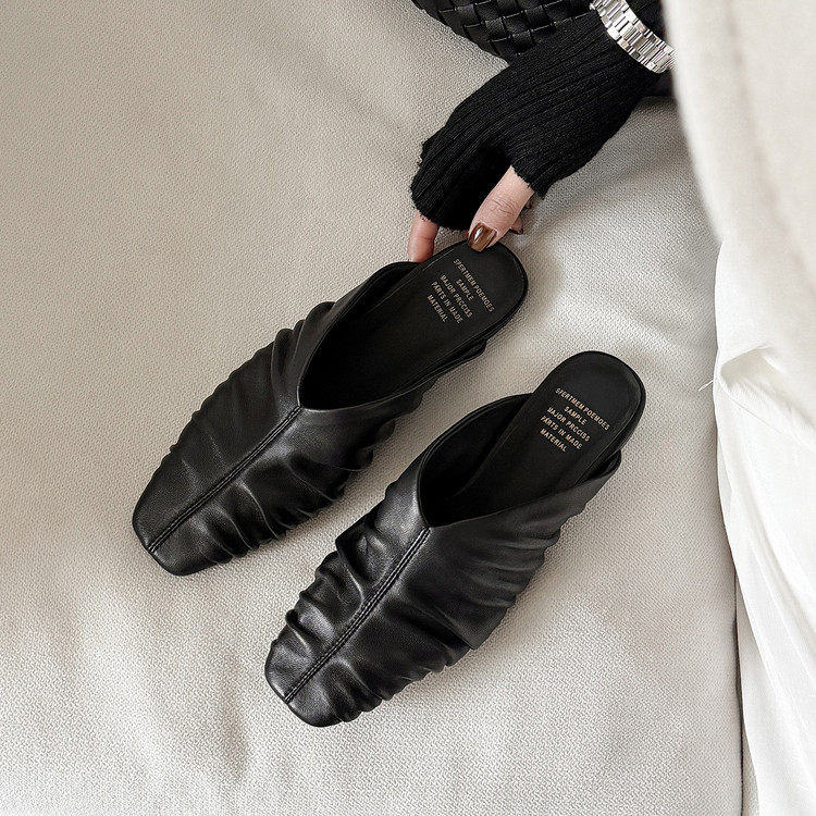 法式复古风真皮羊皮褶皱包头拖鞋女平跟一脚蹬百搭穆勒鞋透气夏天