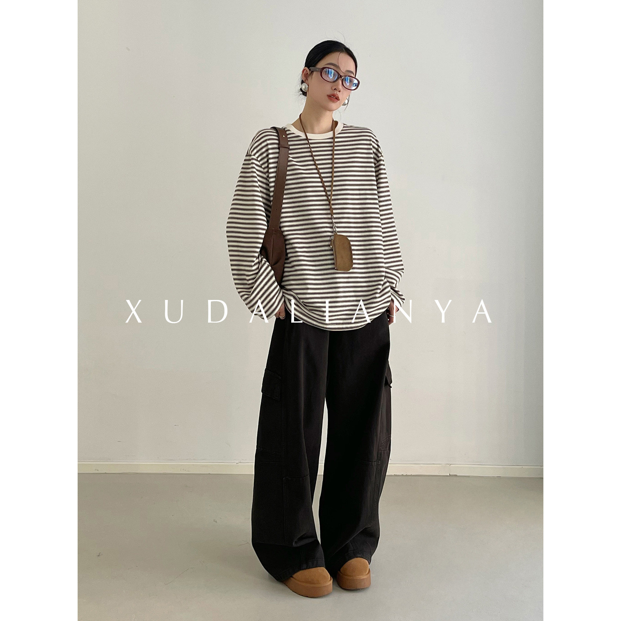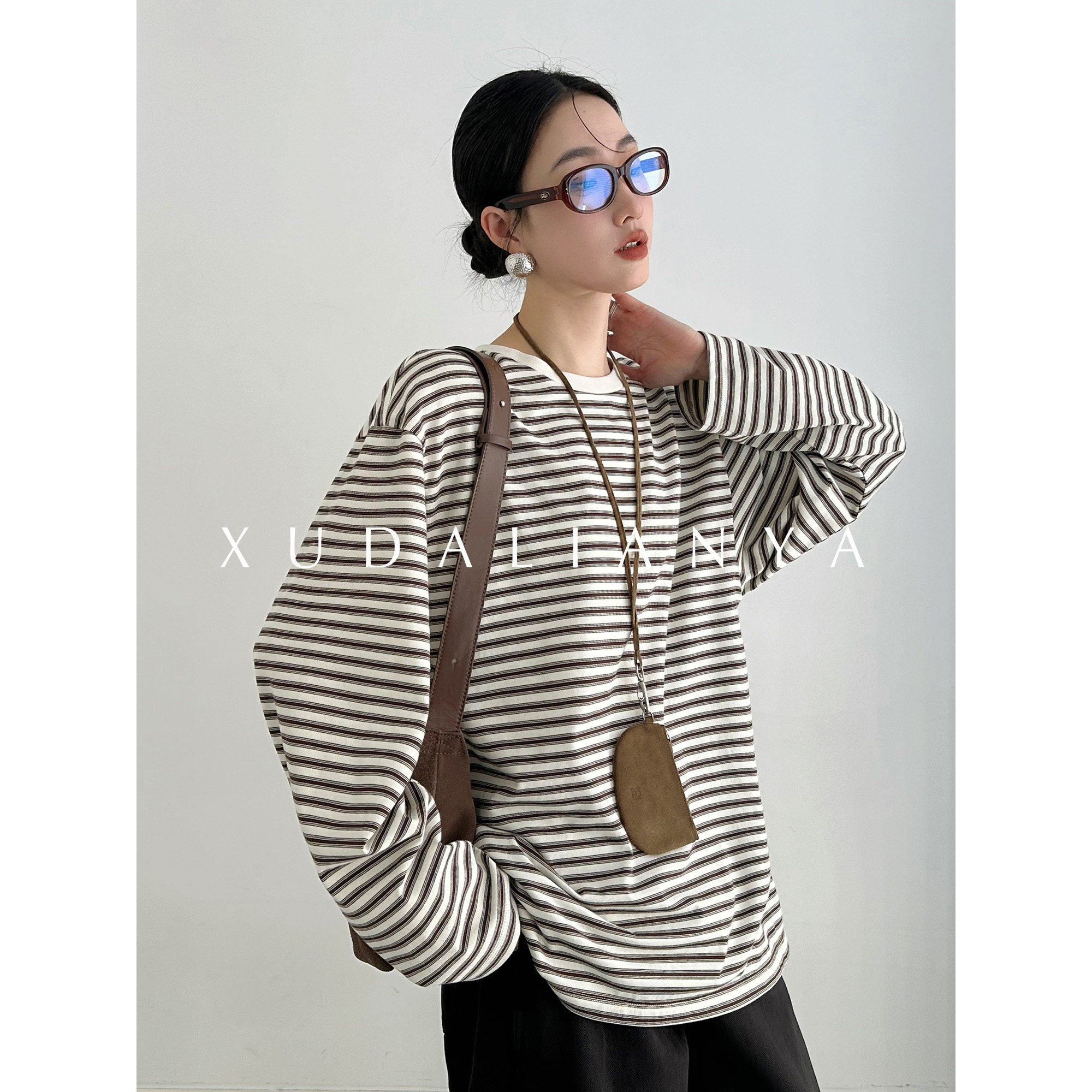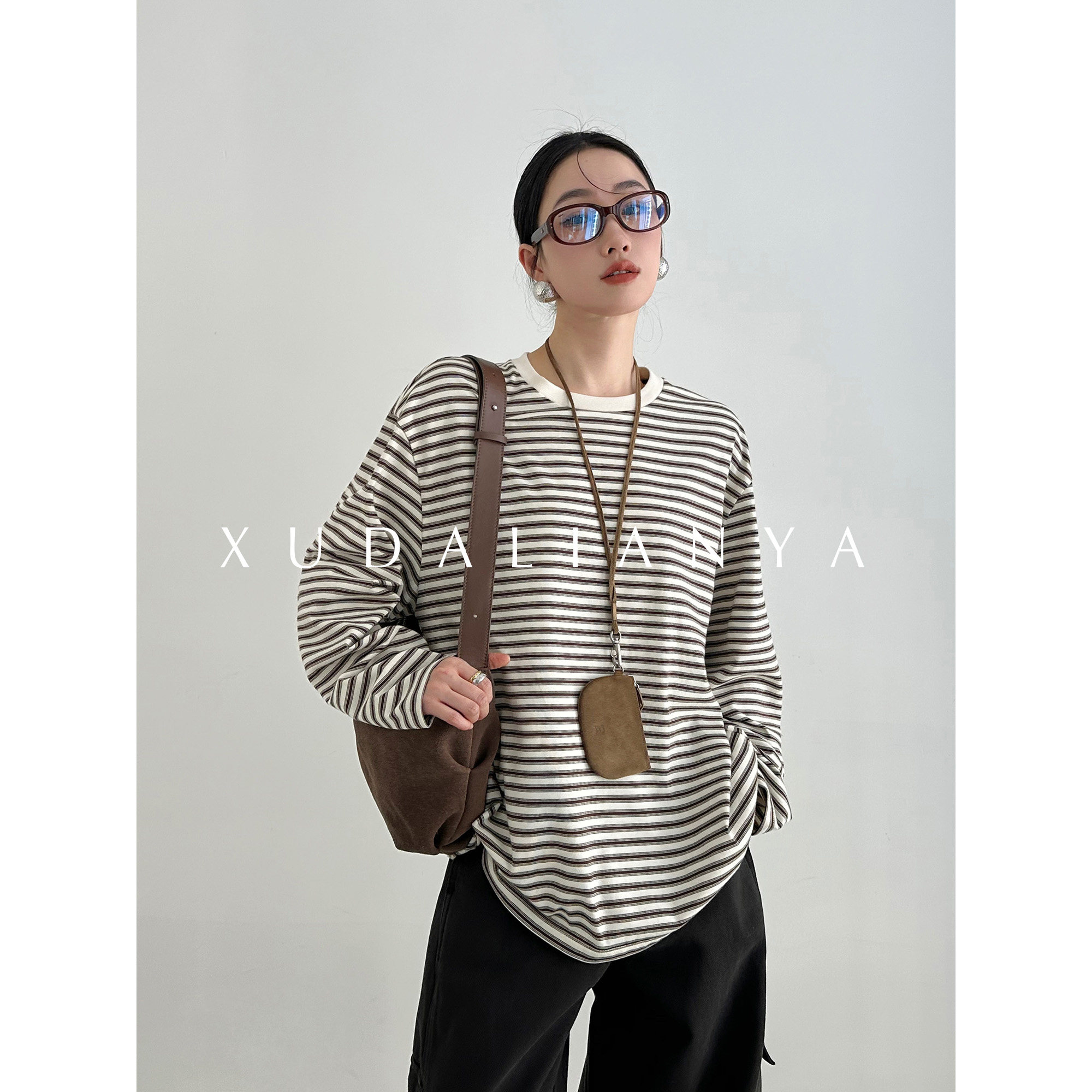 徐大脸吖定制 韩系复古全棉圆领针织衫春秋休闲条纹长袖T恤女上衣