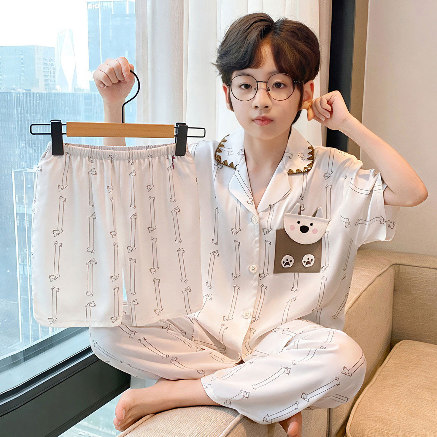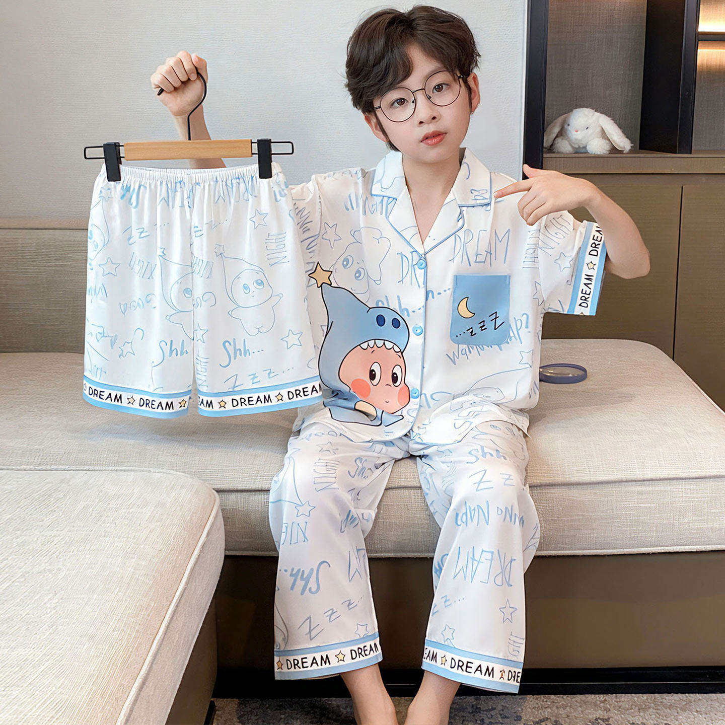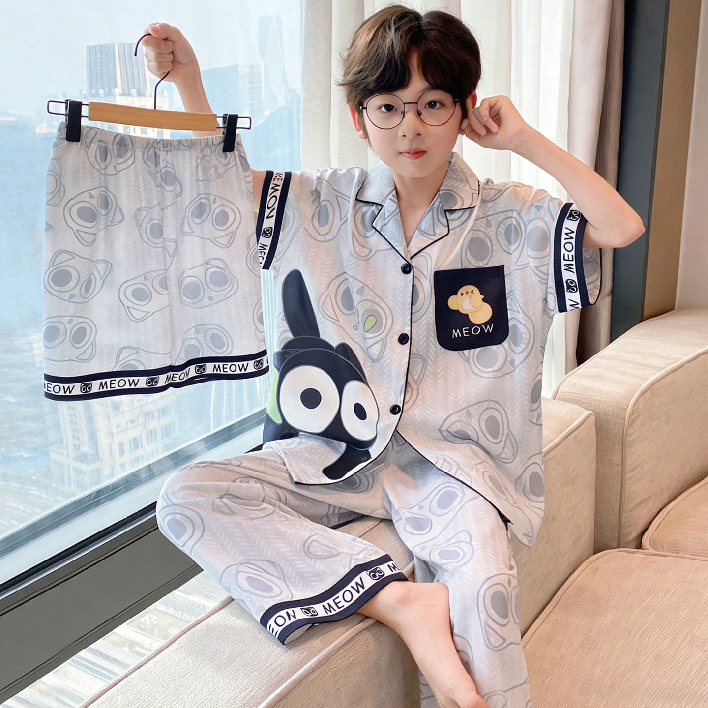卡皮巴拉男童睡衣夏季冰丝短袖中大童学生青少年儿童家居服三件套