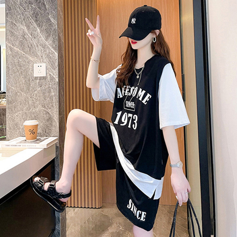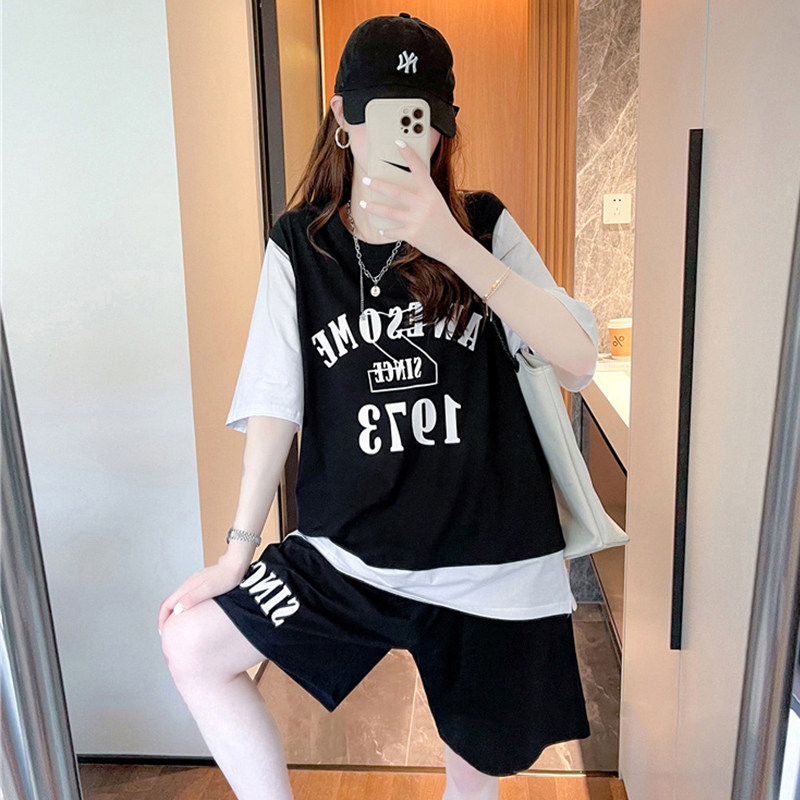大码女装2026新款夏季休闲运动套装短裤胖mm宽松上衣服假两件套装