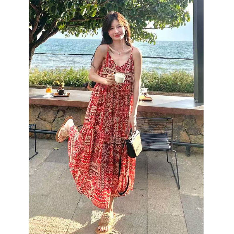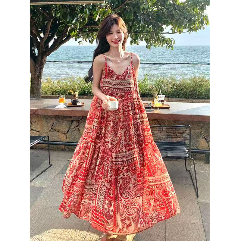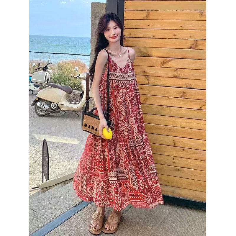 红色度假风印花连衣裙女2026夏新款气质松弛感吊带长裙~清仓福利