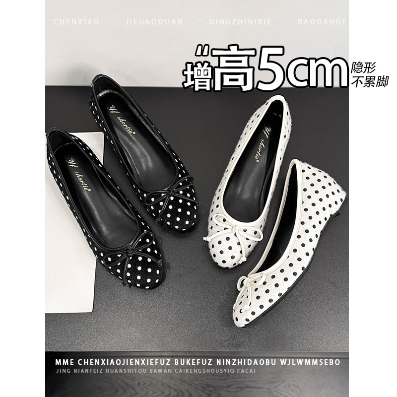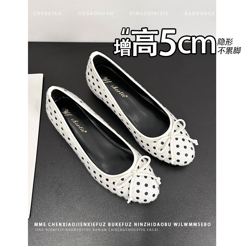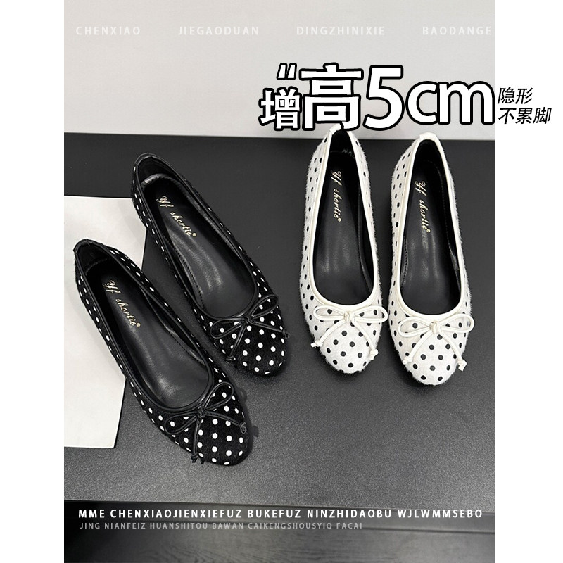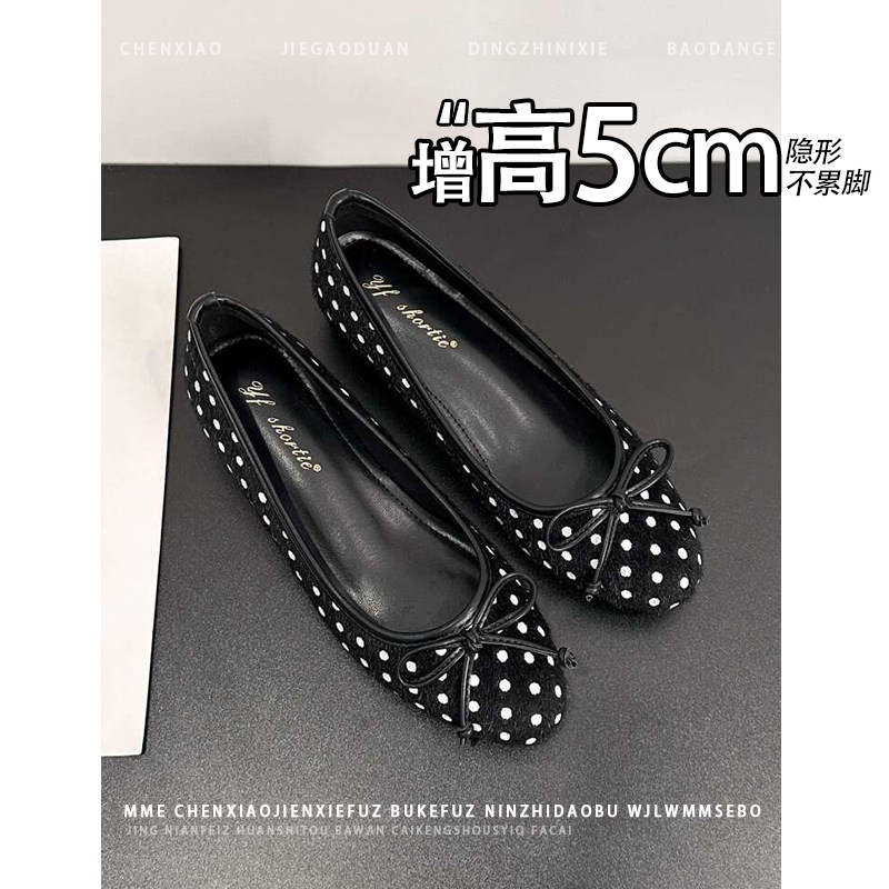 不累脚!内增高5CM玛丽珍鞋秋冬波点蝴蝶结浅口绒面芭蕾单鞋女
