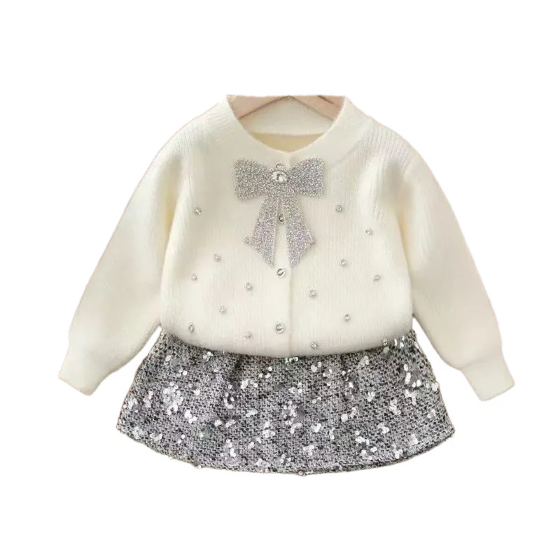 女宝宝小香风针织衫秋冬季新款女童蝴蝶结水钻亮片毛衣裙子两件套