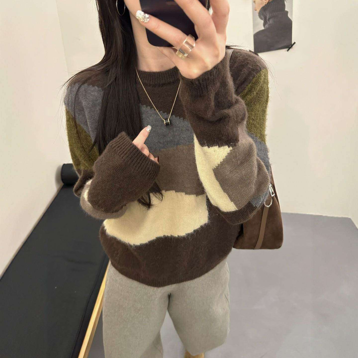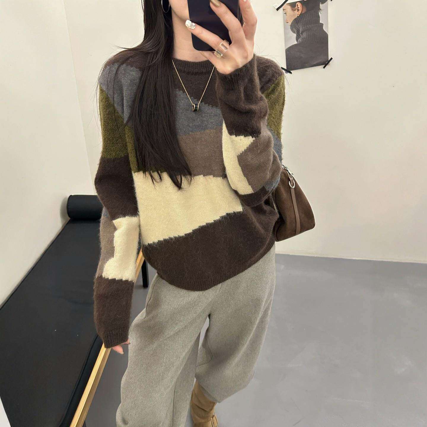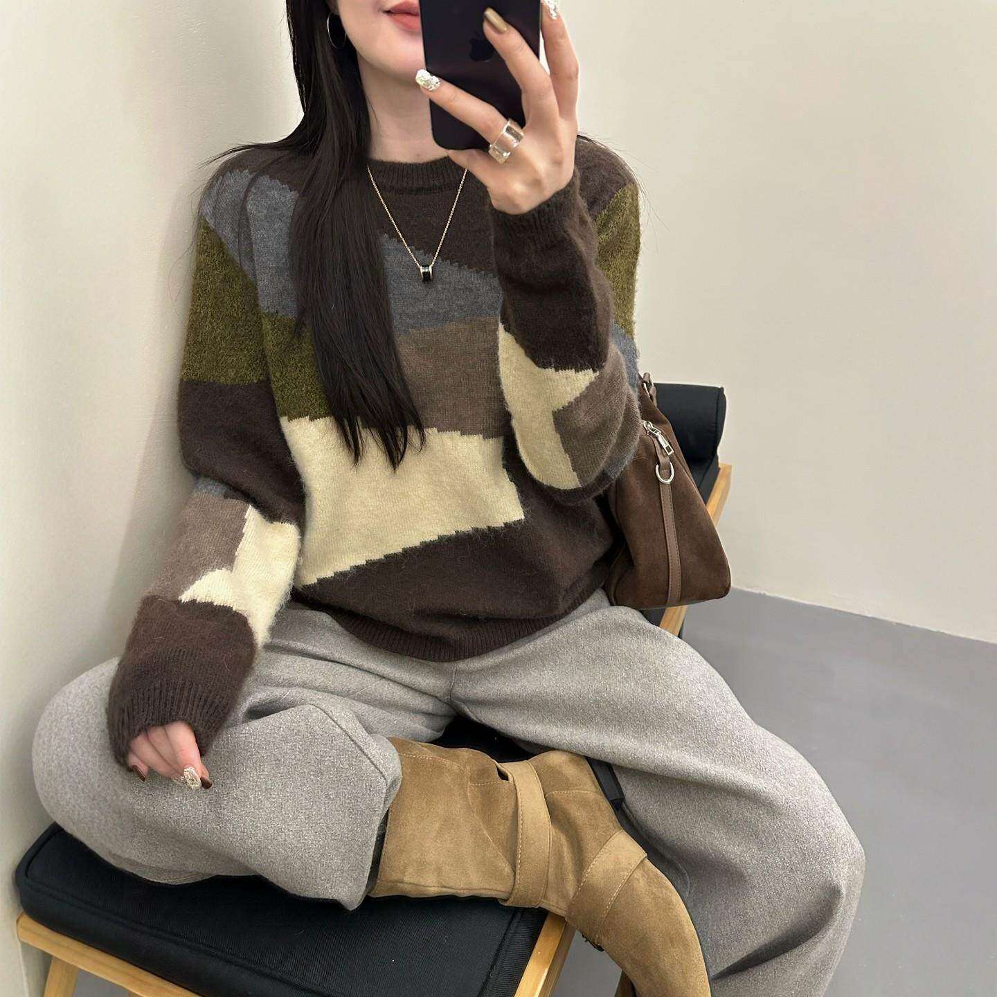 秋冬女士加厚拼色毛衣女款2025新款冬季爆款高级感宽松针织打底衫