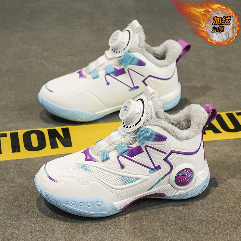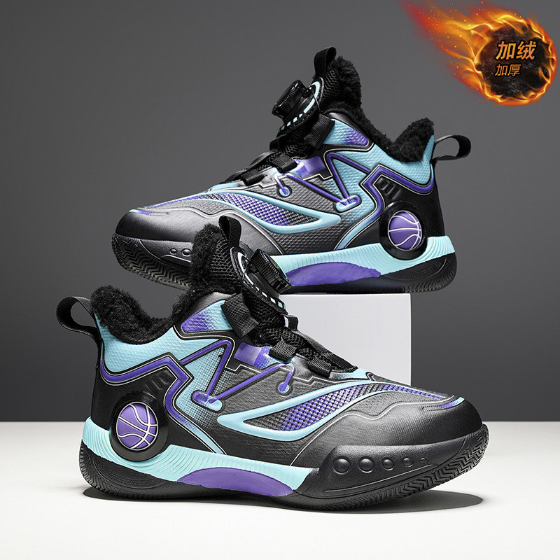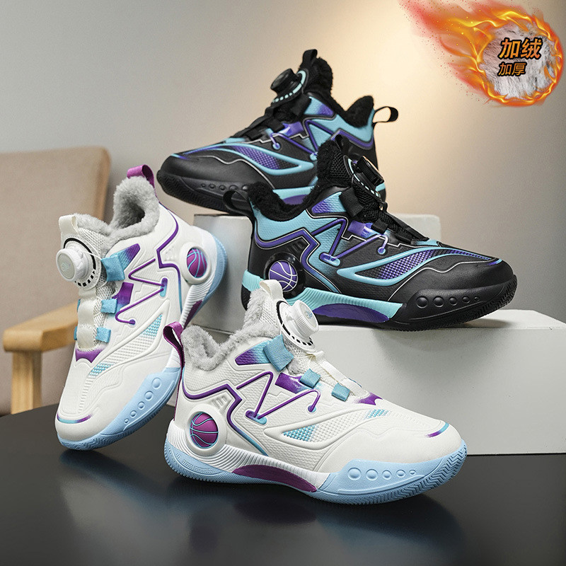 秋冬款高帮运动鞋男款加绒青少年篮球鞋中大童防滑旋转纽扣跑步鞋