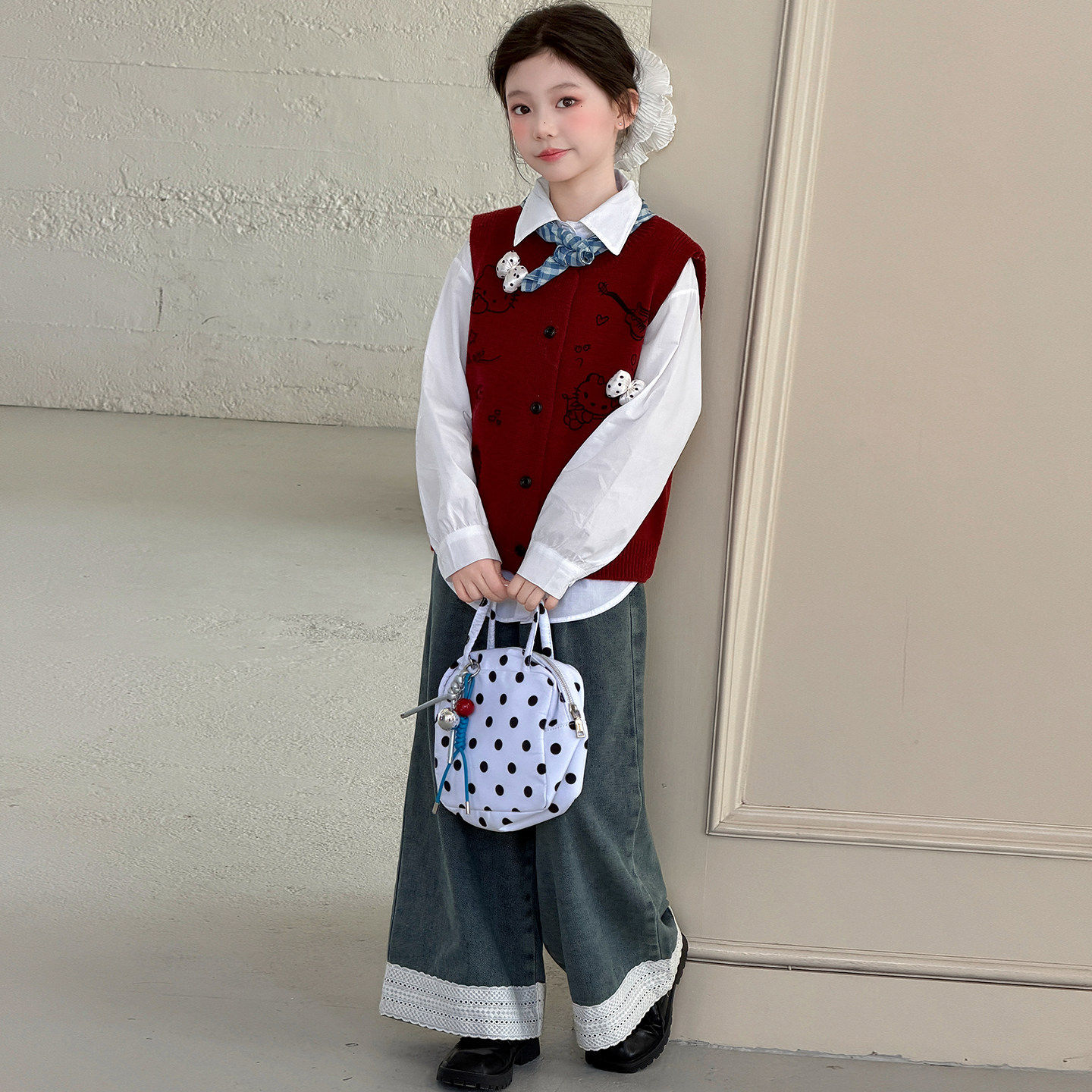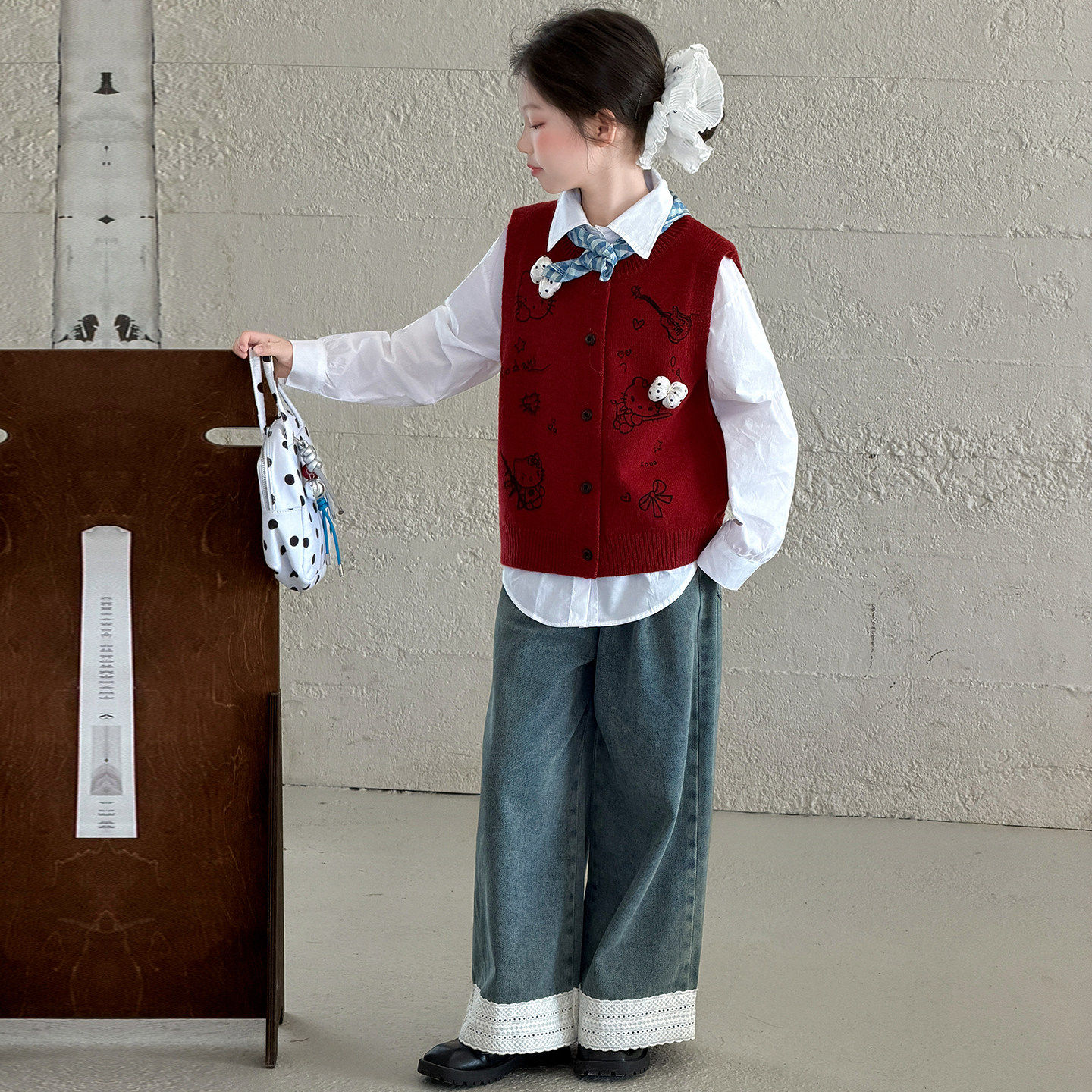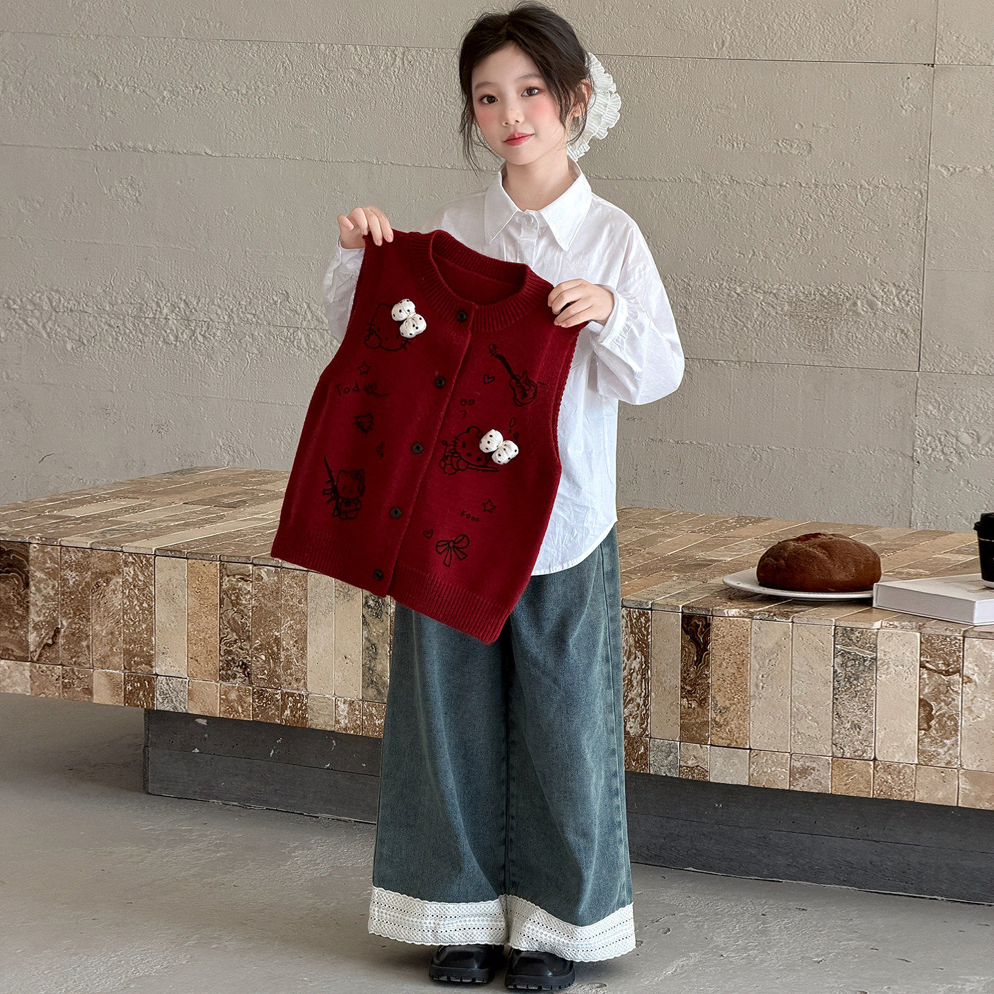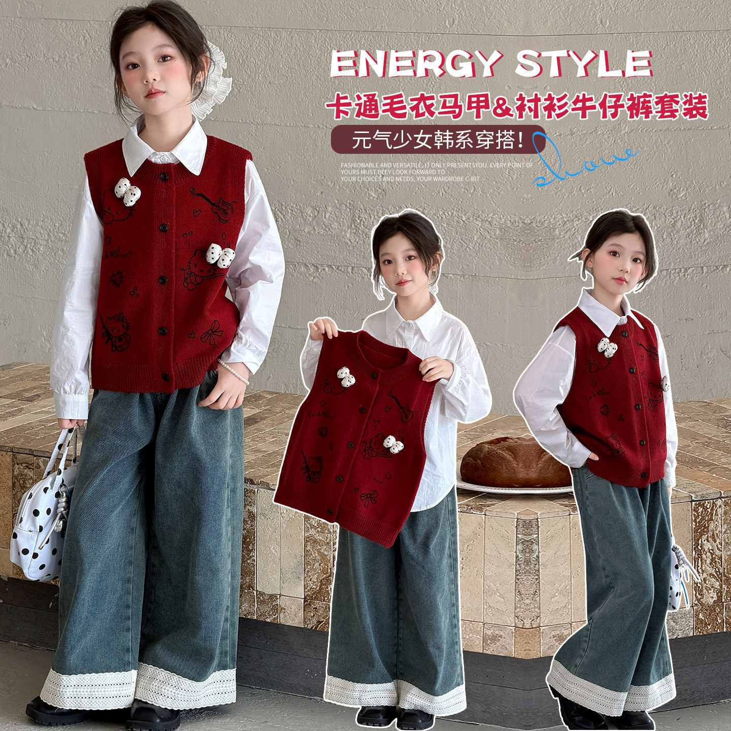 女童2026春季新款毛衣马甲三件套女孩春秋洋气针织背心牛仔裤套装