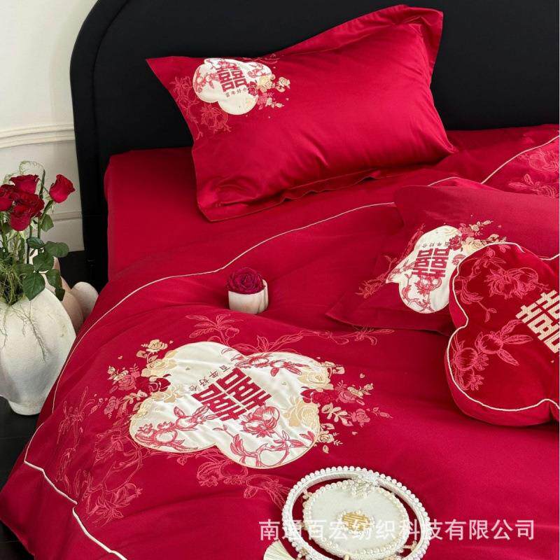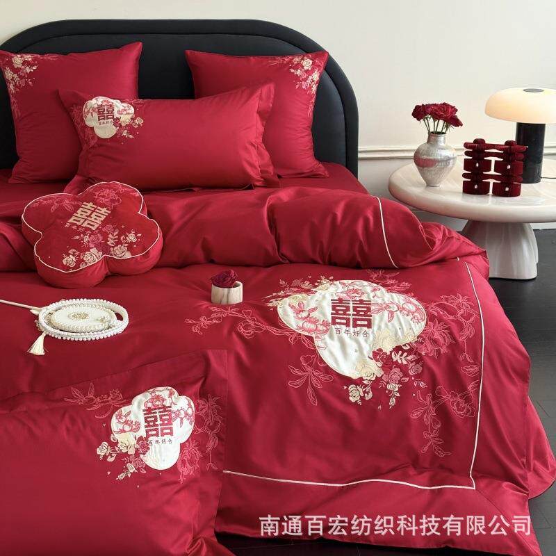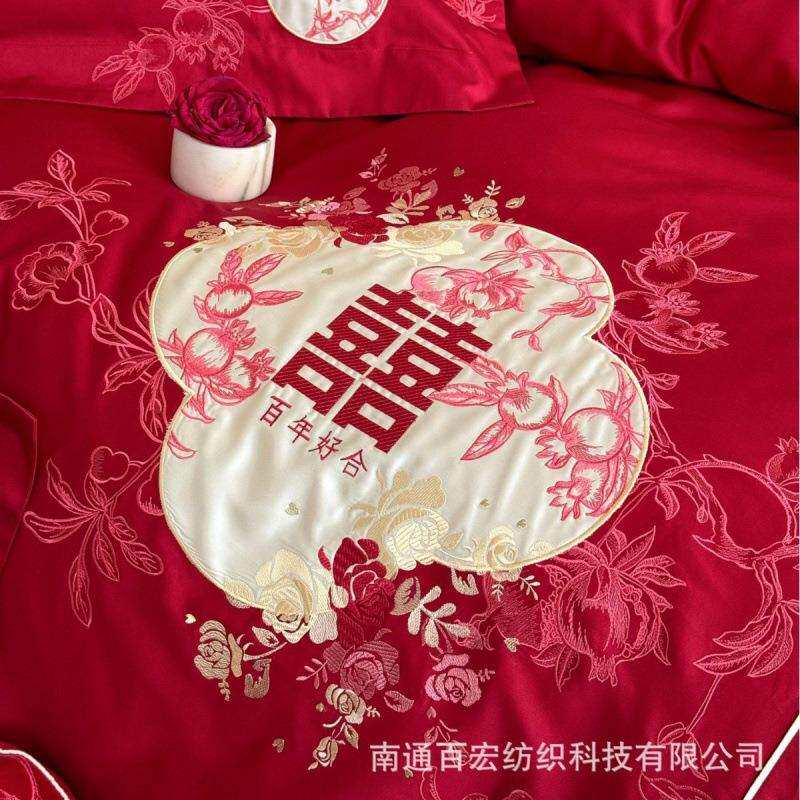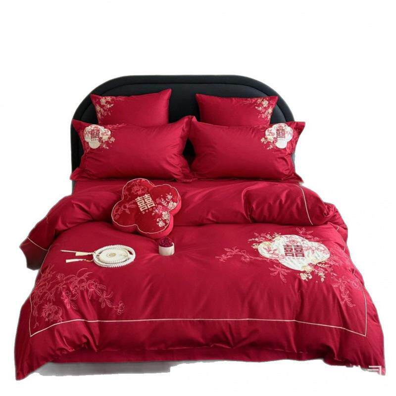婚庆100S长绒棉红色结婚四件套纯棉床单被套女方陪嫁喜被四季通用