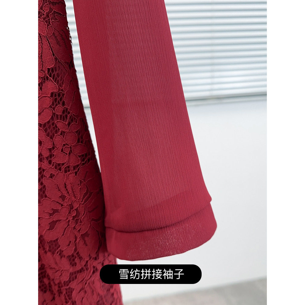 特大码女装红色蕾丝连衣裙长袖春秋装高级感显瘦300斤胖mm裙子