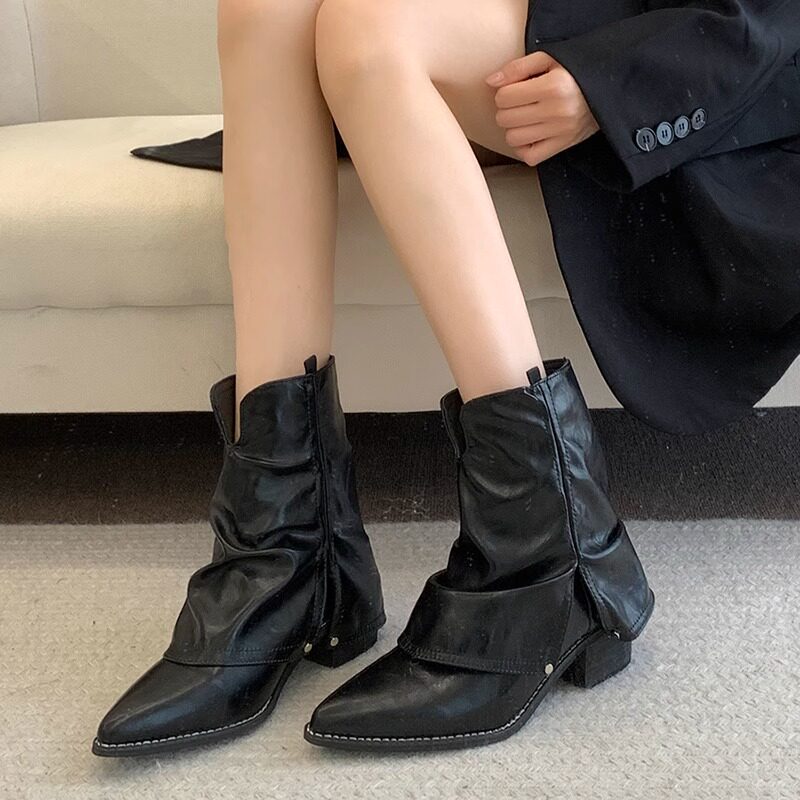 粗跟尖头裤管靴女春秋2026新款夏季甜酷西部牛仔炸街小短靴子黑色