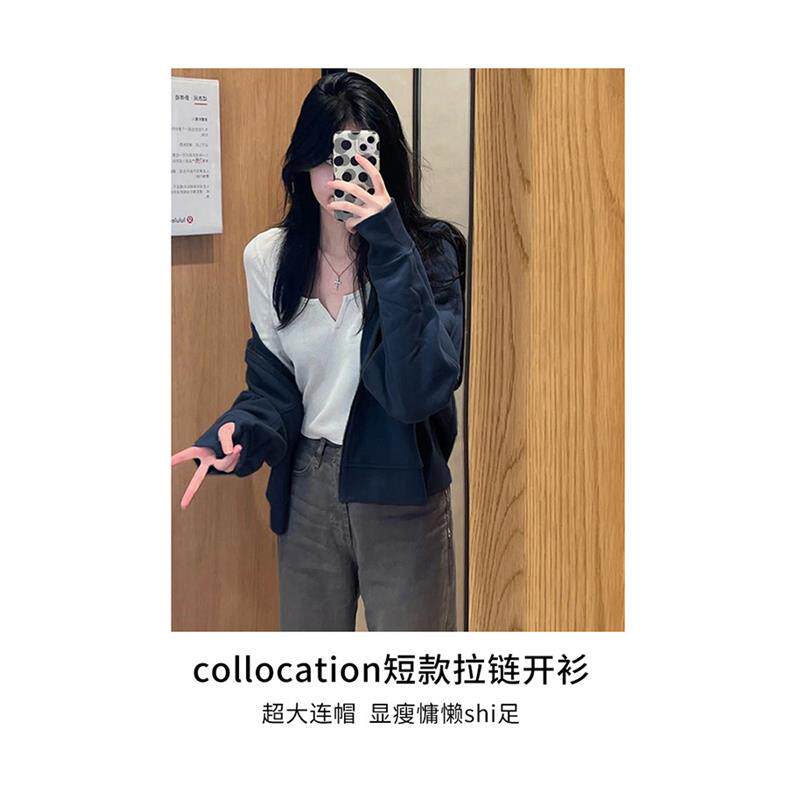 藏青正肩薄外套女款早秋冬季短款卫衣小个子上衣韩系开衫2025新款