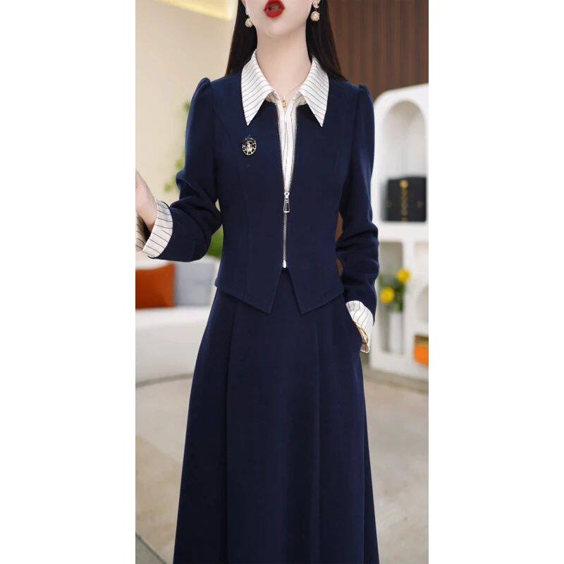 311线报网描述:显瘦设计感翻领假两件休闲裙子