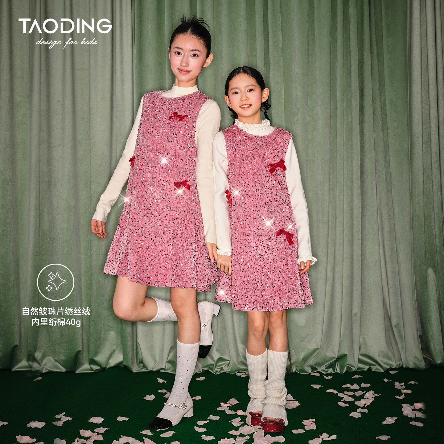 淘町亲子女童珠片绣丝绒蝴蝶结连衣裙秋冬大童高端新年圣诞背心裙