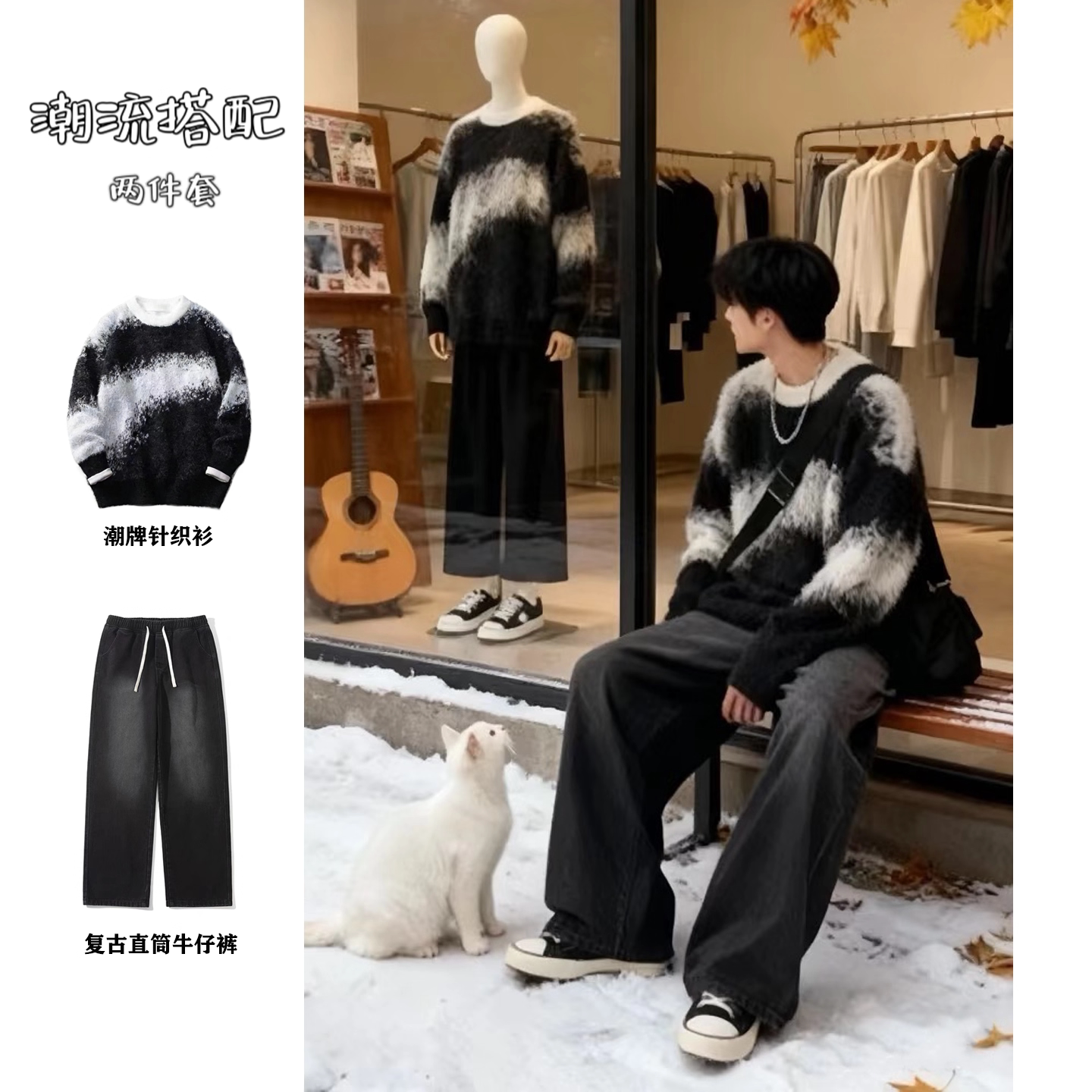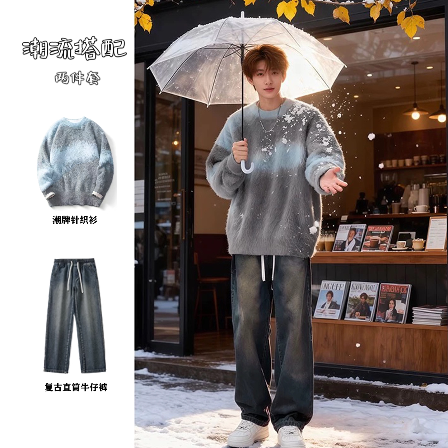 年轻毛衣男生青少年ootd穿搭秋冬套装复古针织衫外套男装一套搭配