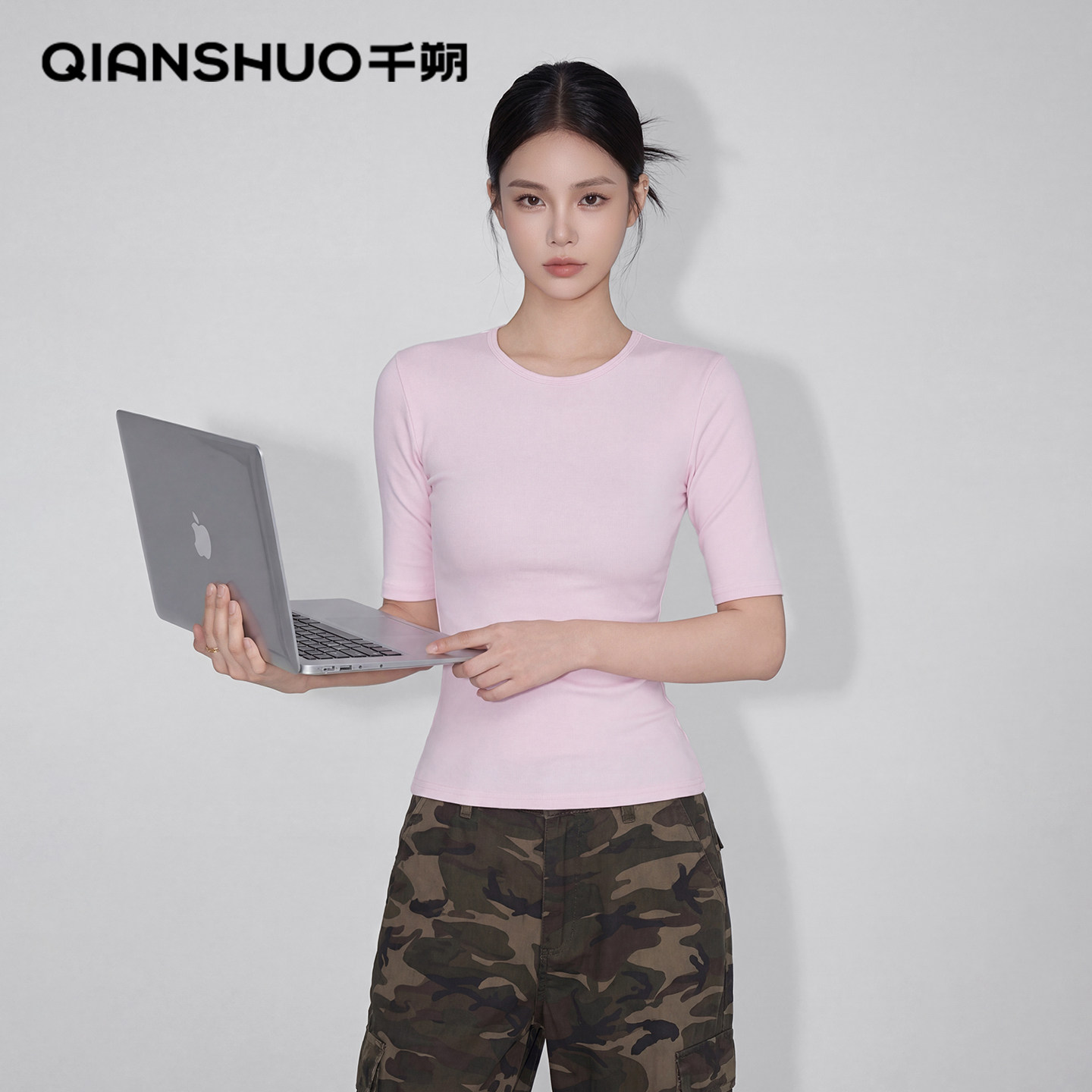 千朔中袖t恤女款2026新款小圆领修身显瘦基础款正肩七分短袖上衣