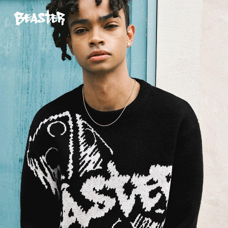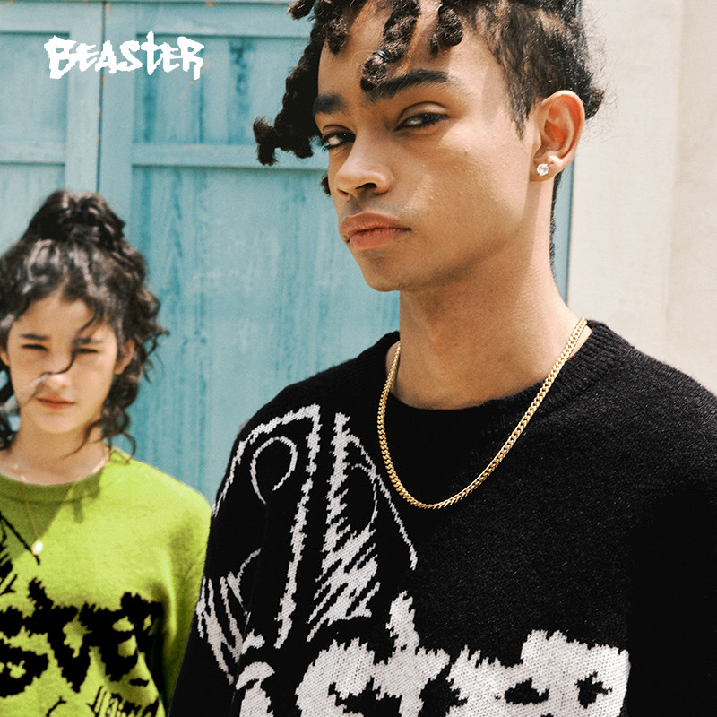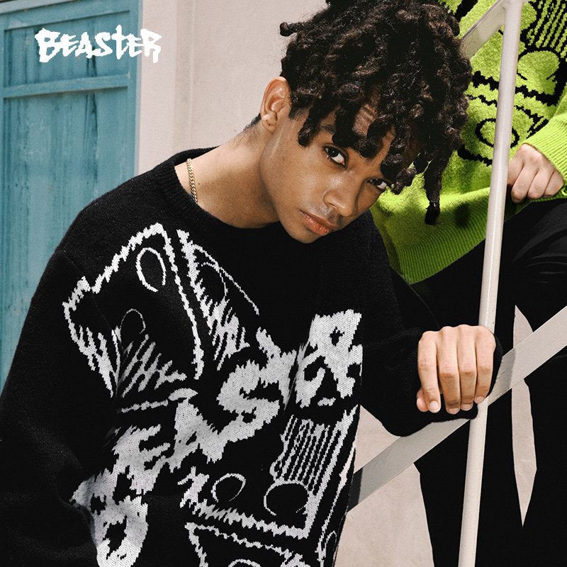BEASTER奥莱骰子提花针织衫男秋新款荧光绿色圆领慵懒高街毛衣女