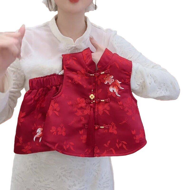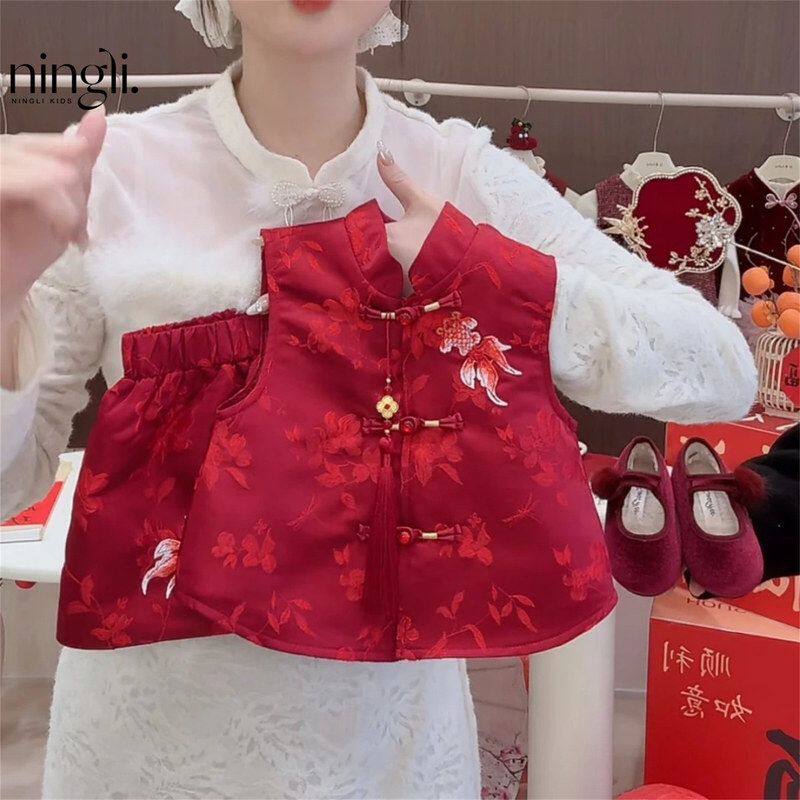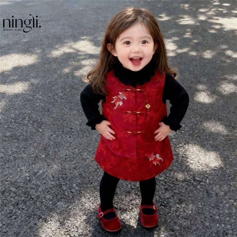 【柠里】女童中国风新年套装红色刺绣盘扣背心裙毛衣两件套拜年服