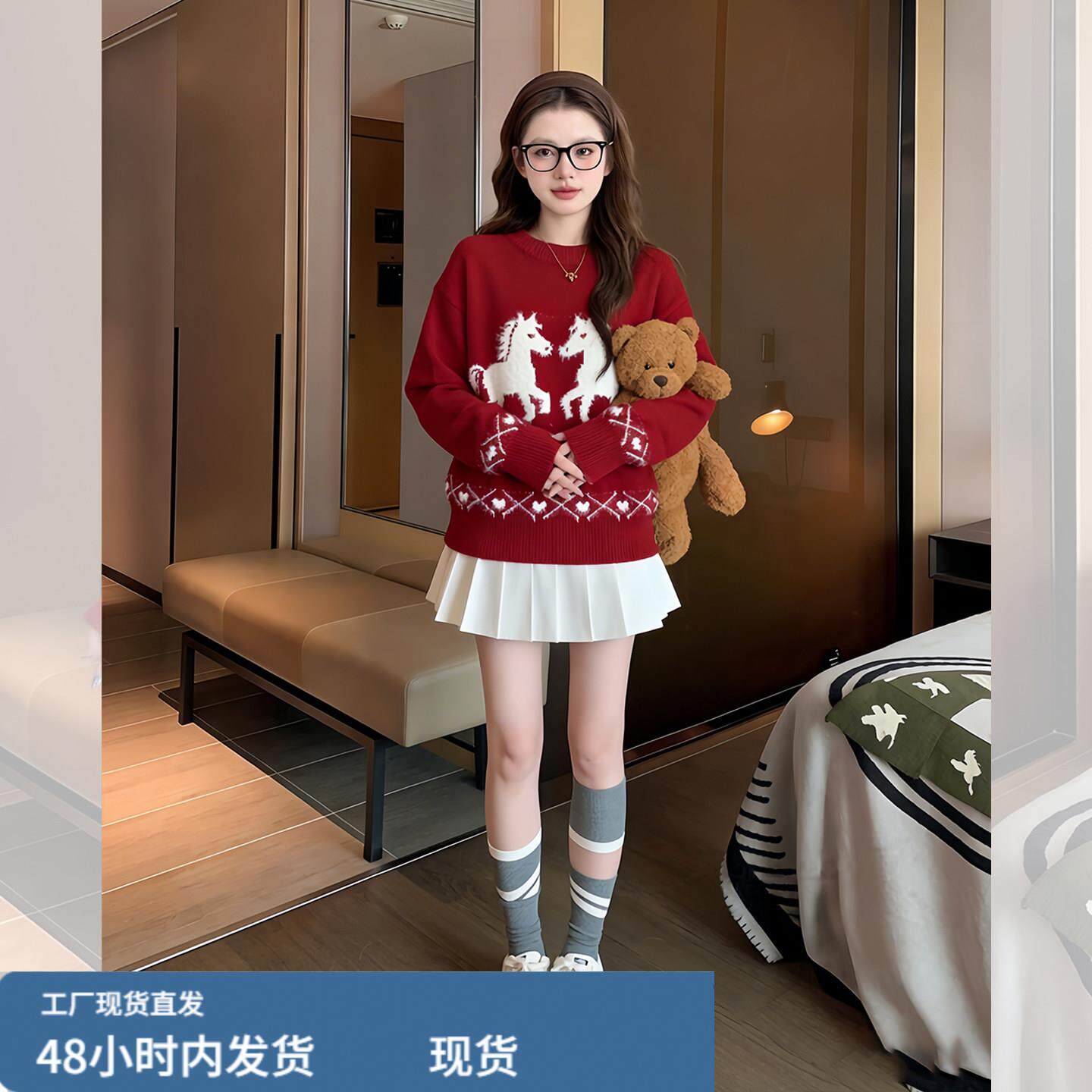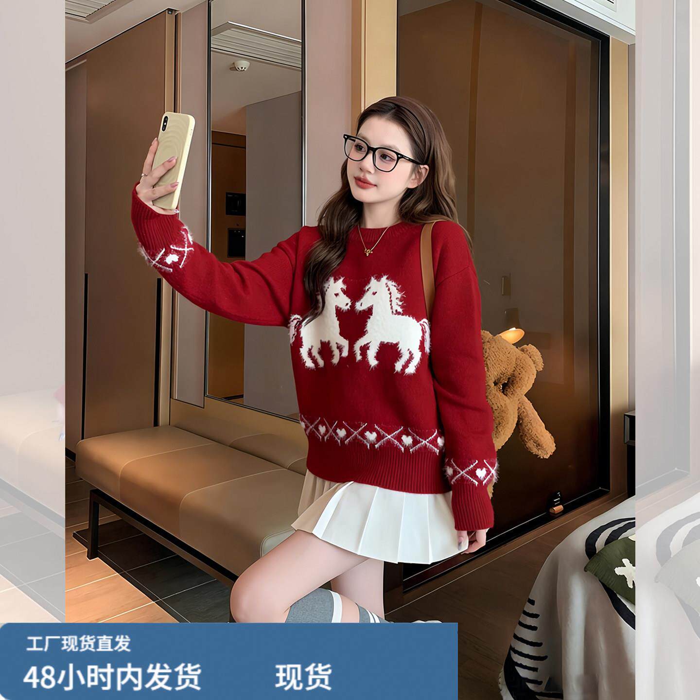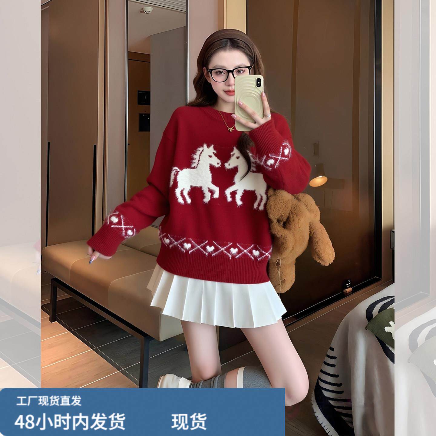 白马红色毛衣女款2026新款冬季多巴胺新年过年穿搭本命年马年衣服