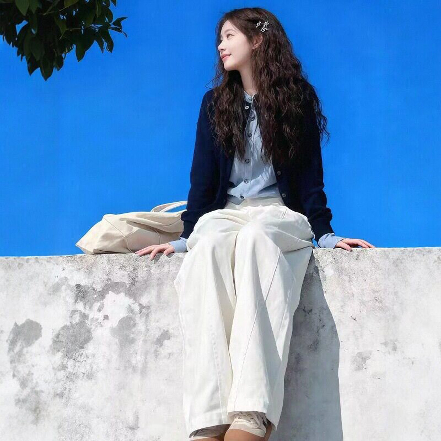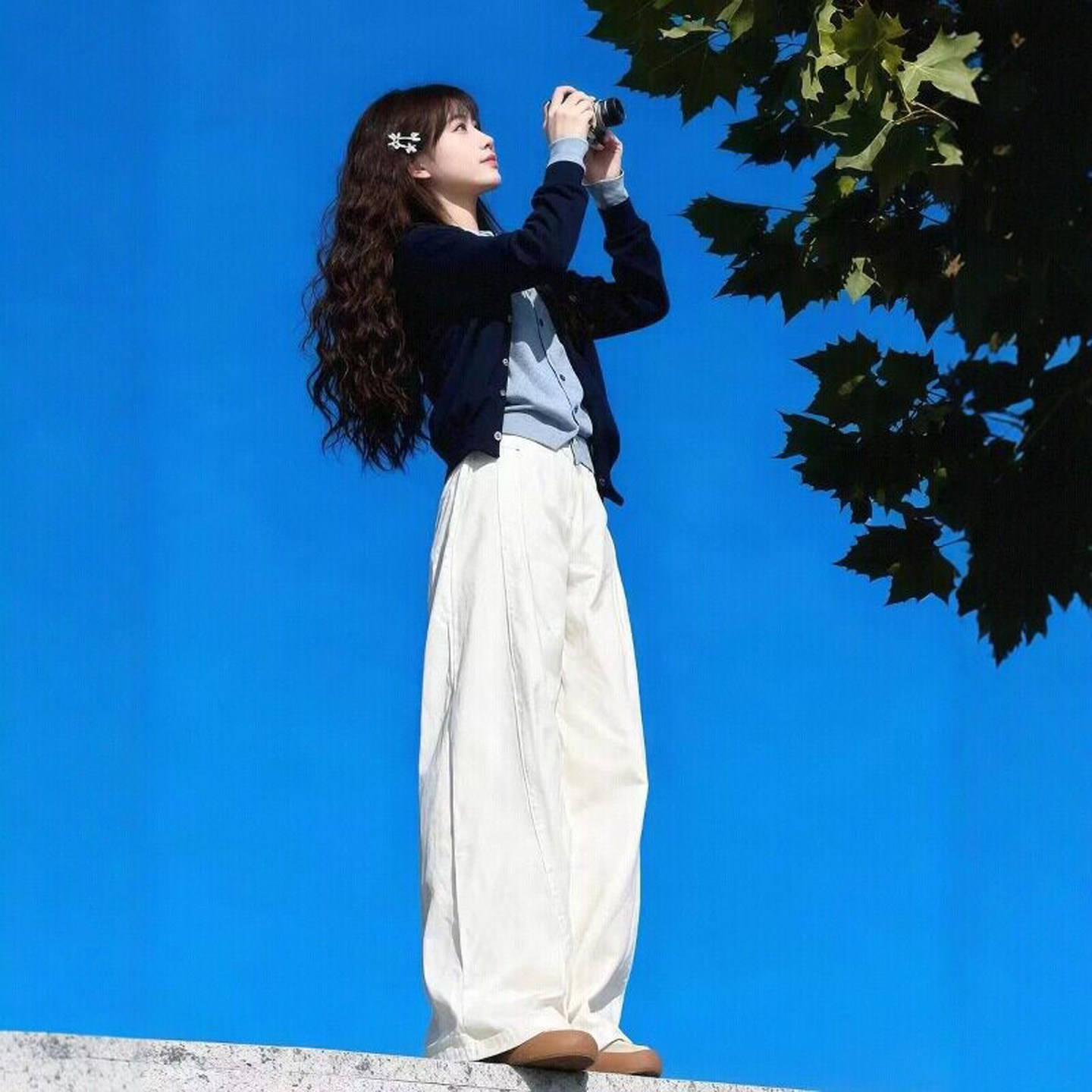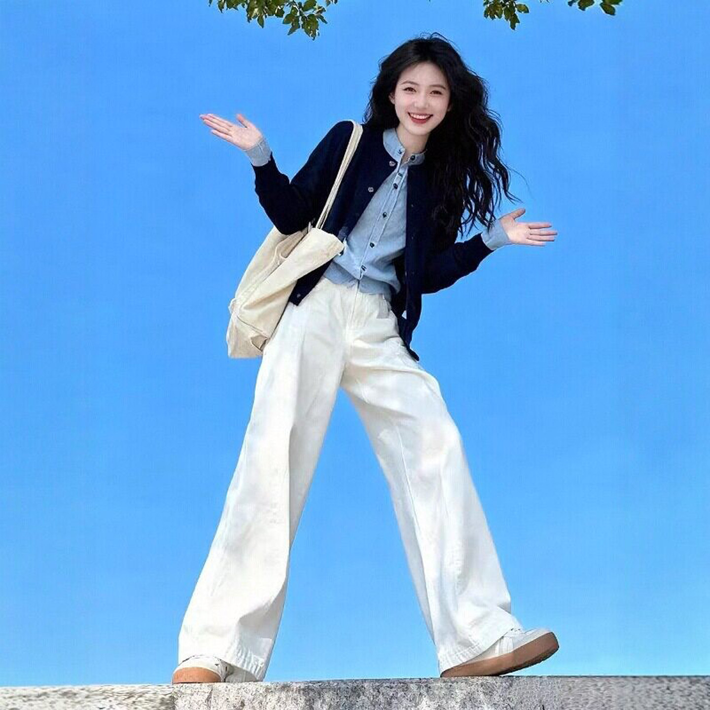米白色褶皱弯刀牛仔裤女2026春夏季新款高腰宽松垂感小个子阔腿裤