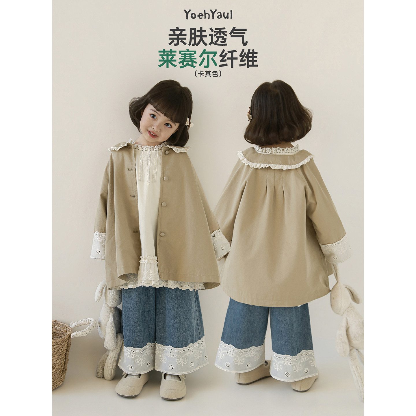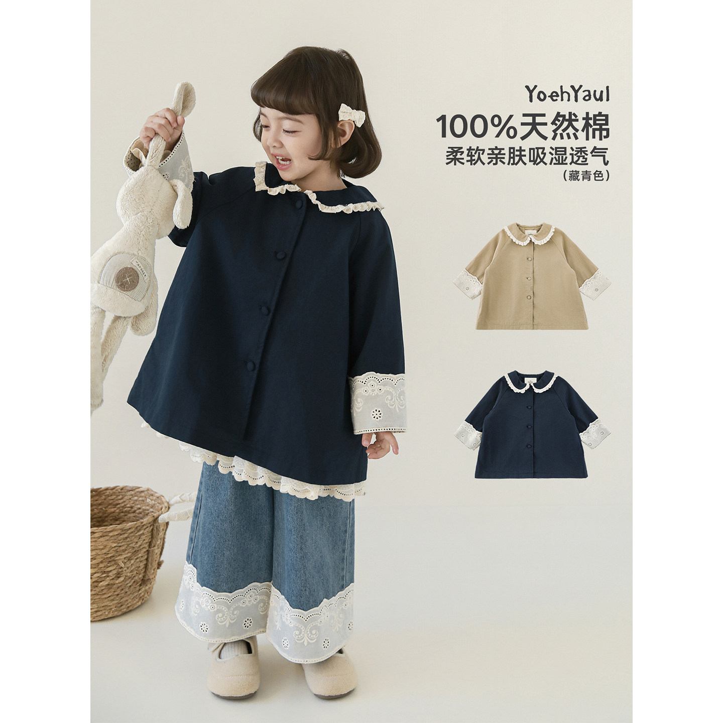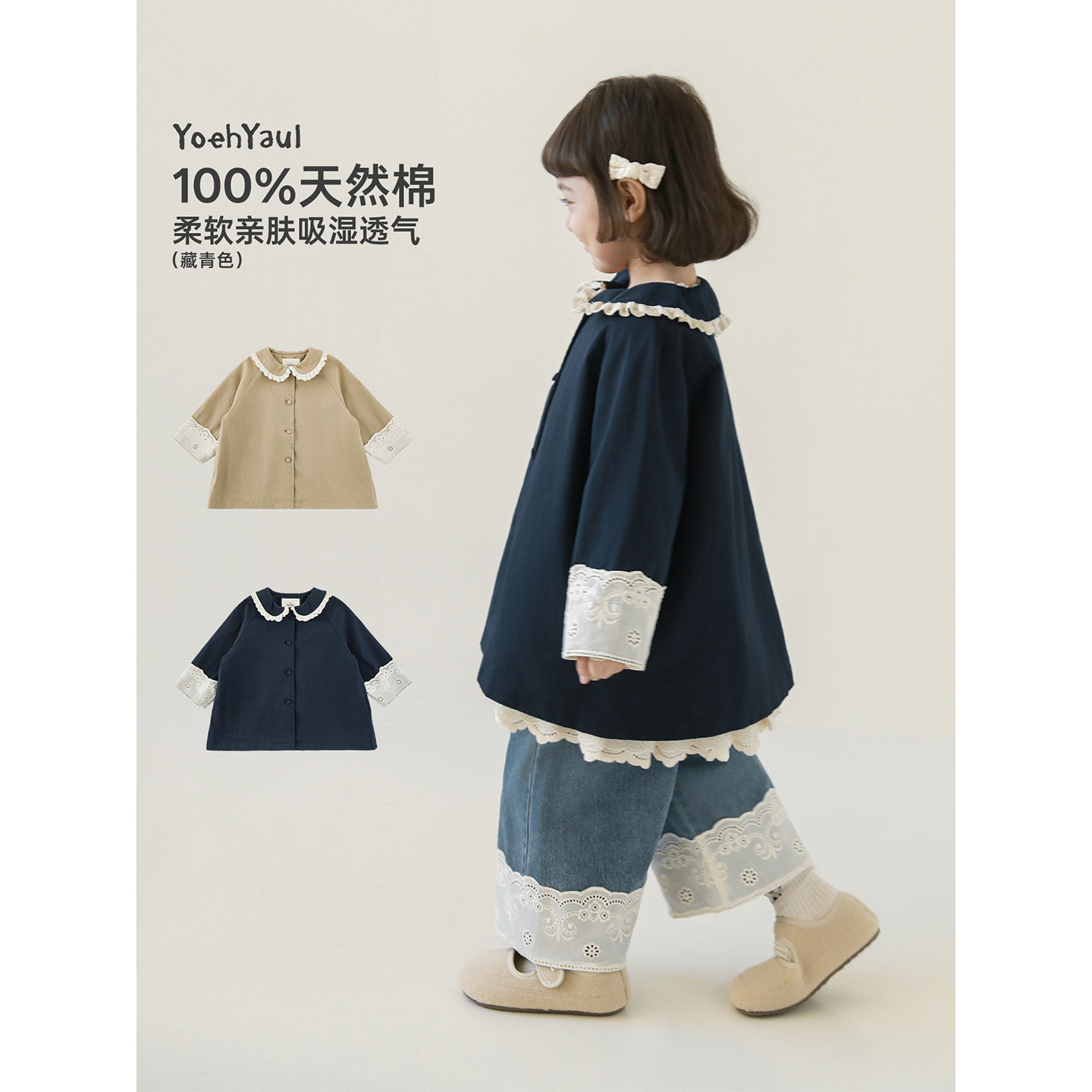 幼悠女童2026春季新款复古蕾丝花边翻领外套时髦百搭宽松早春上衣