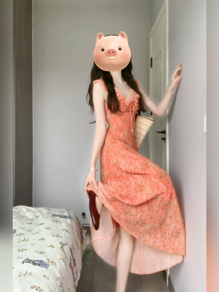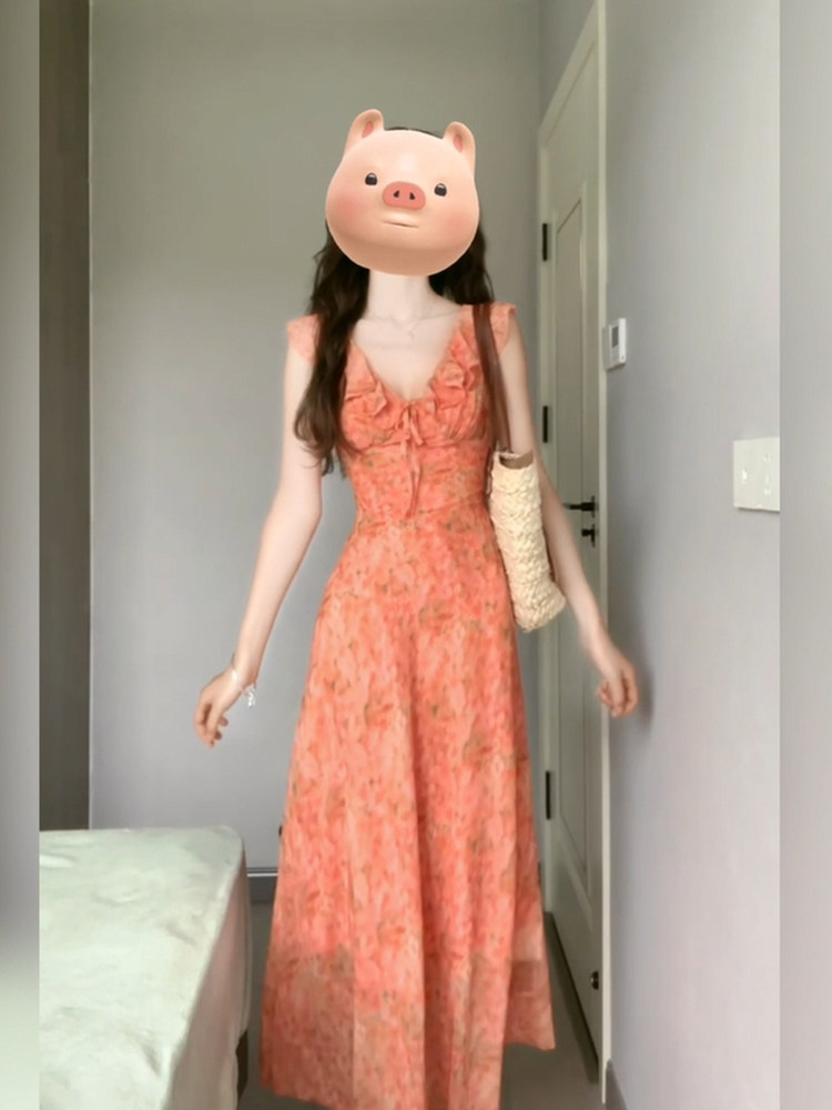 胖mm海边度假风v领碎花连衣裙女夏季高级感显瘦法式气质茶歇长裙