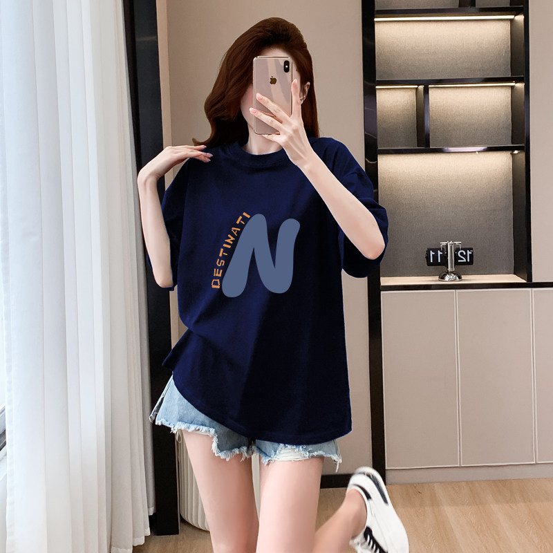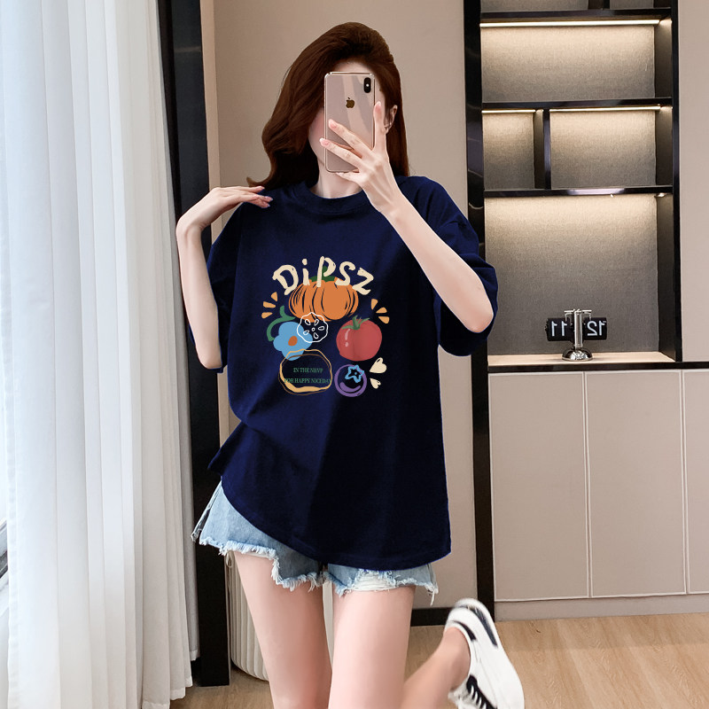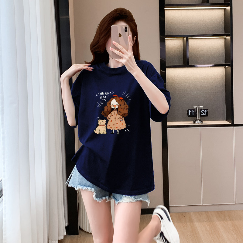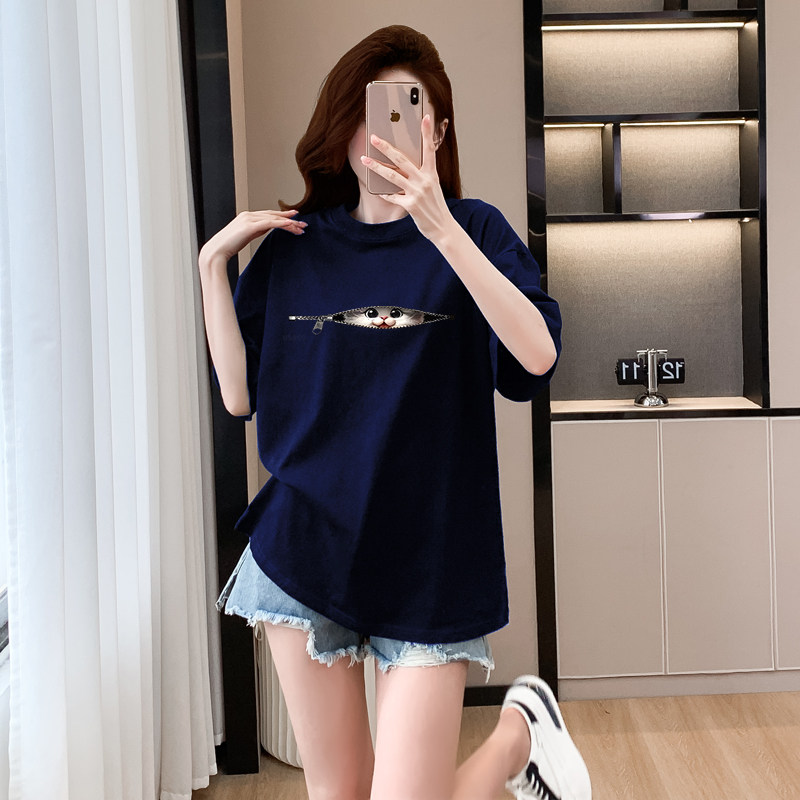 藏蓝色短袖猫咪t恤女纯棉2026新款宽松显瘦半袖洋气减龄上衣体恤