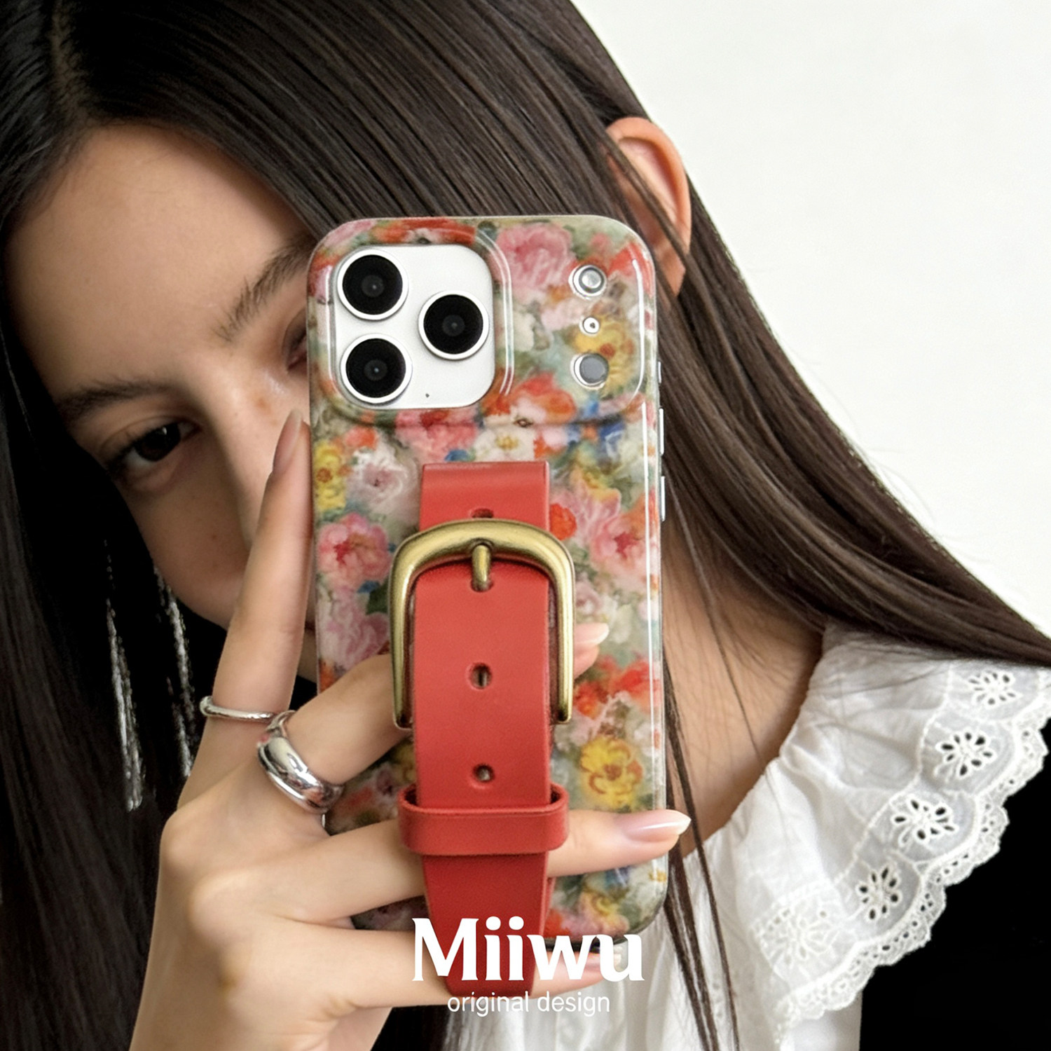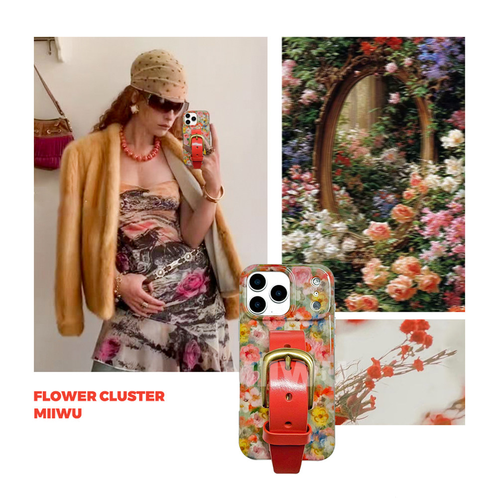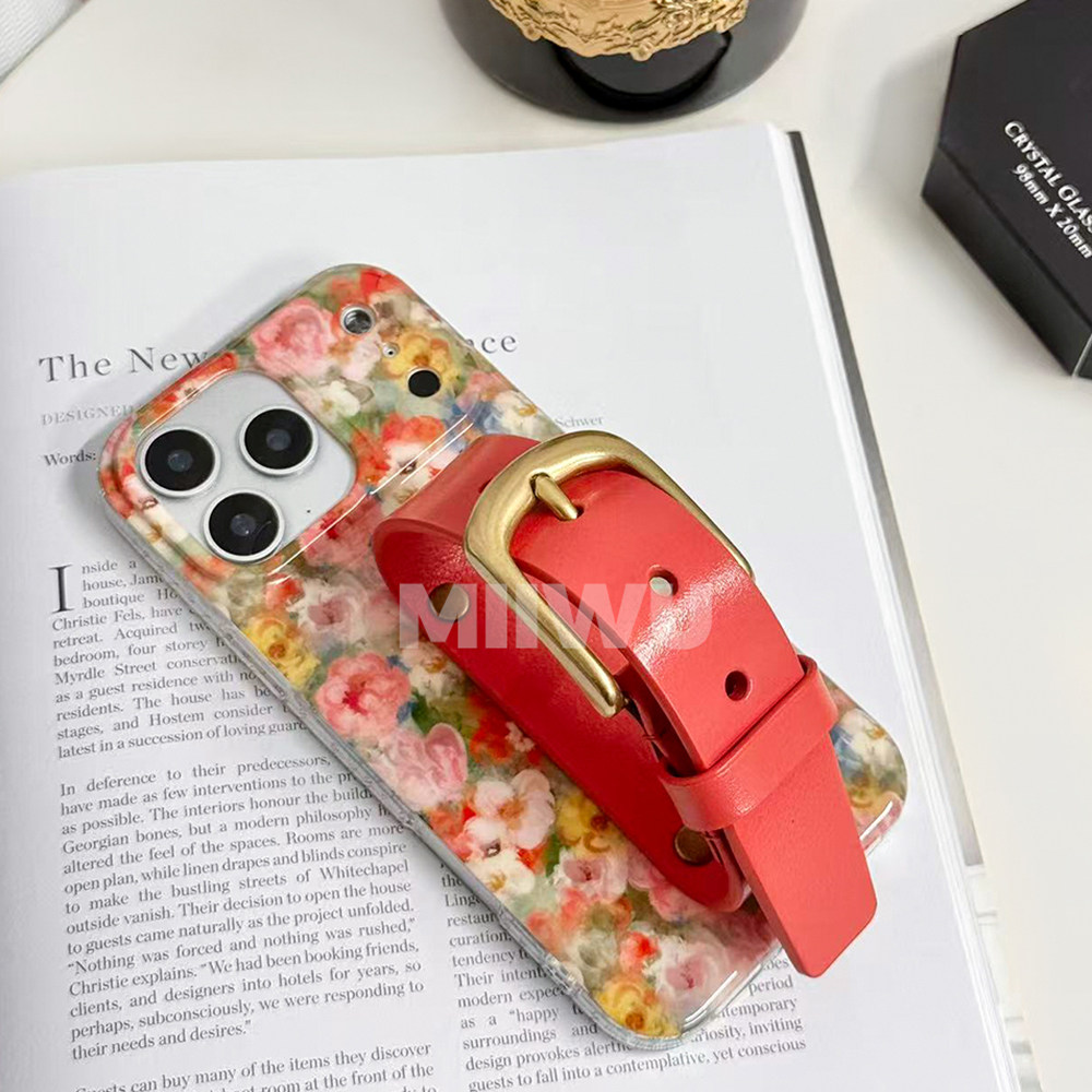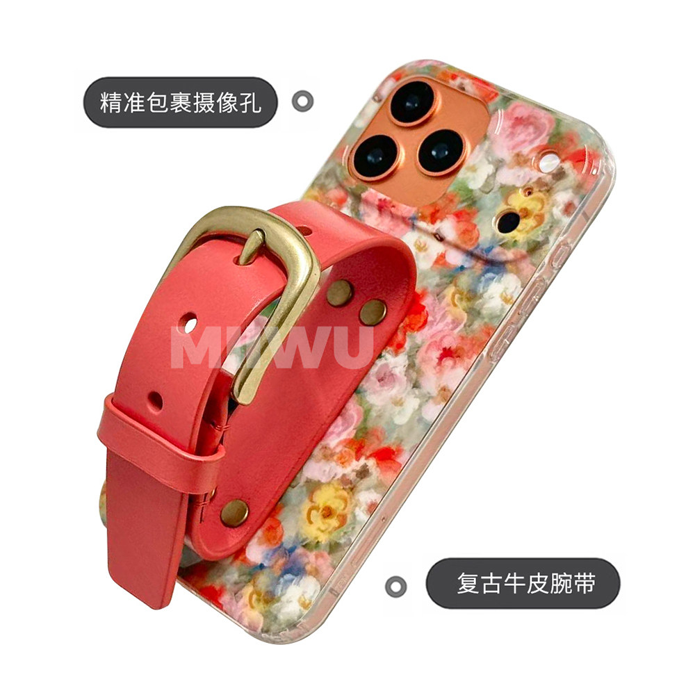 法式油画花簇橘色系植糅牛皮腕带手机壳适用苹果系列iphone17 promax经典铜扣全包手机保护套16/15手机保护壳