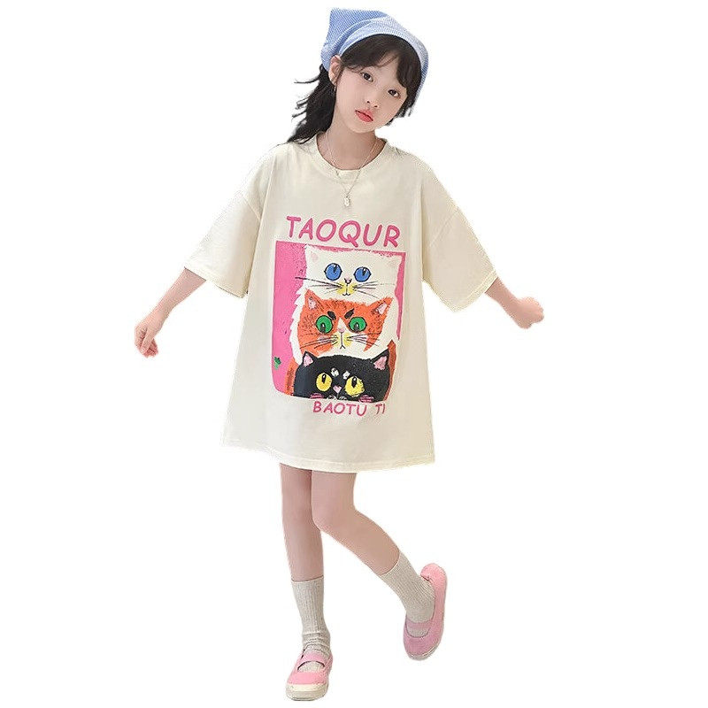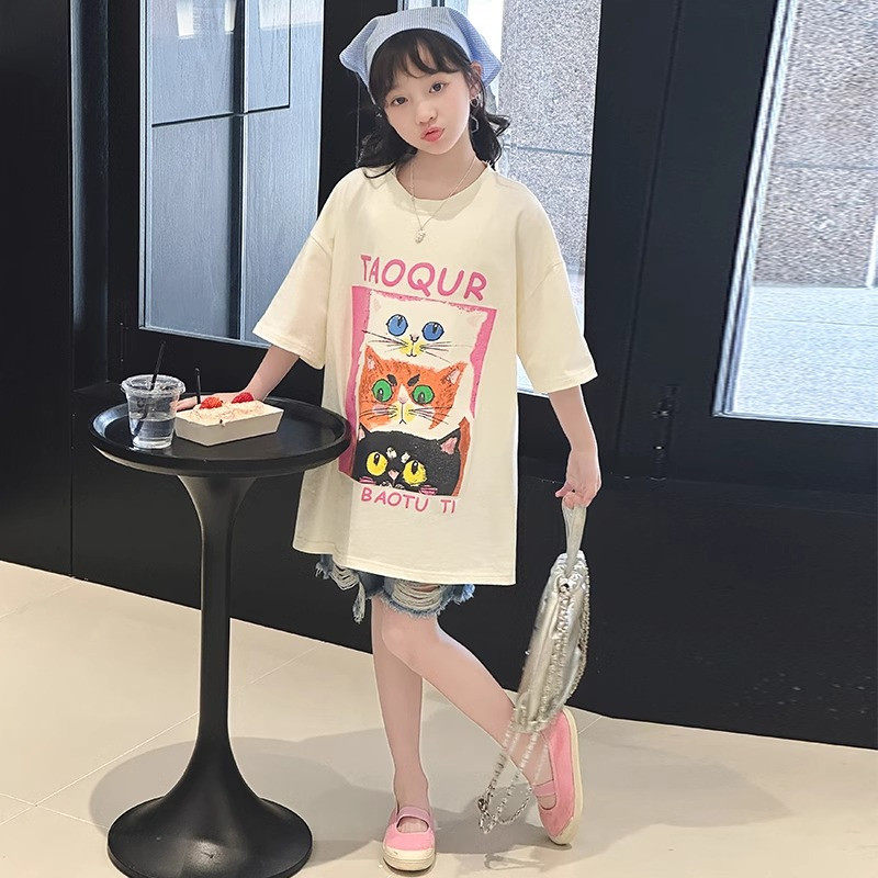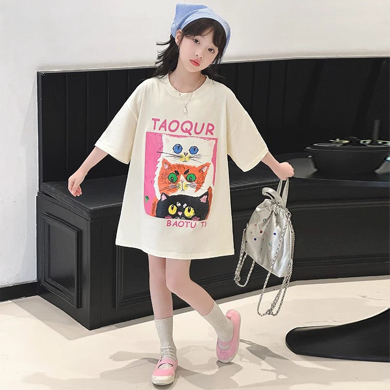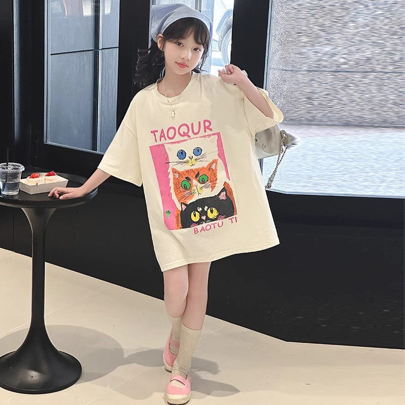 女童夏装新款短袖T恤9岁女孩中长款洋气7女大童宽松6儿童纯棉上衣