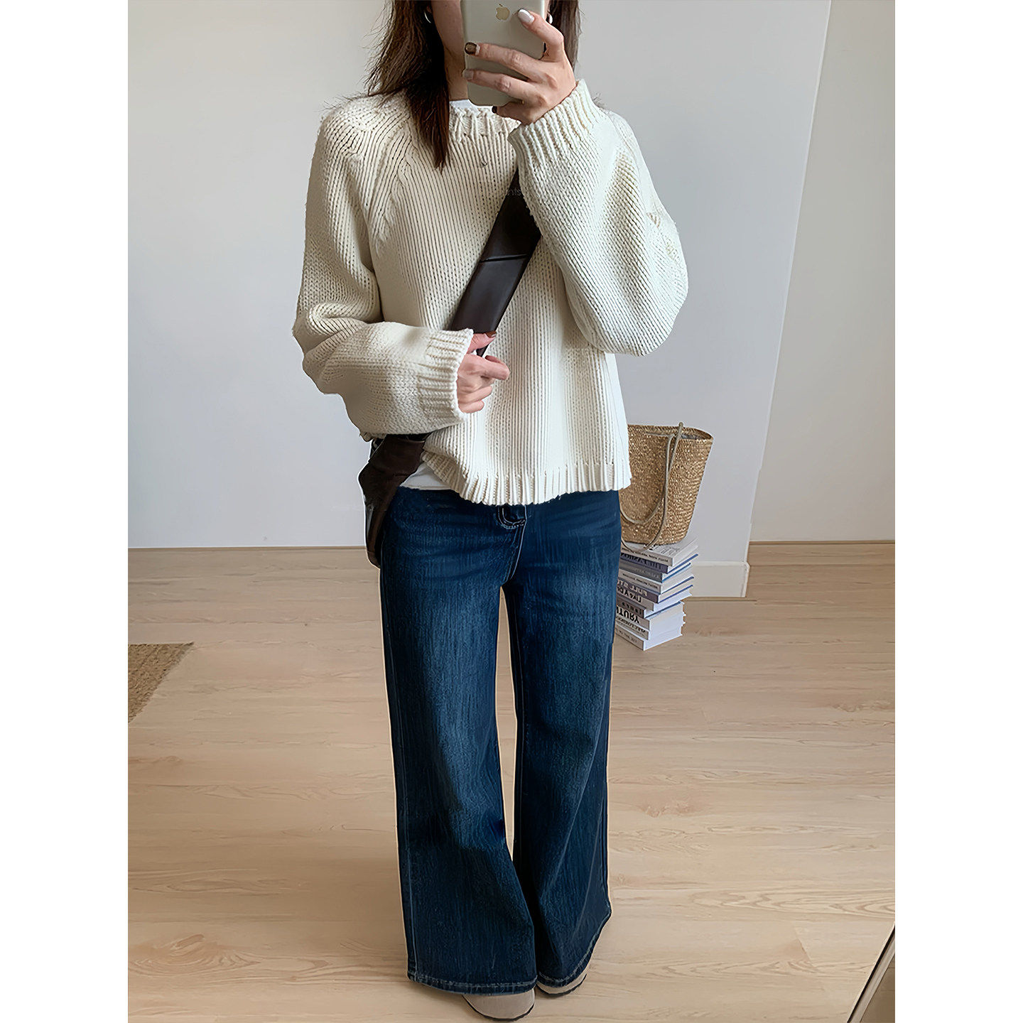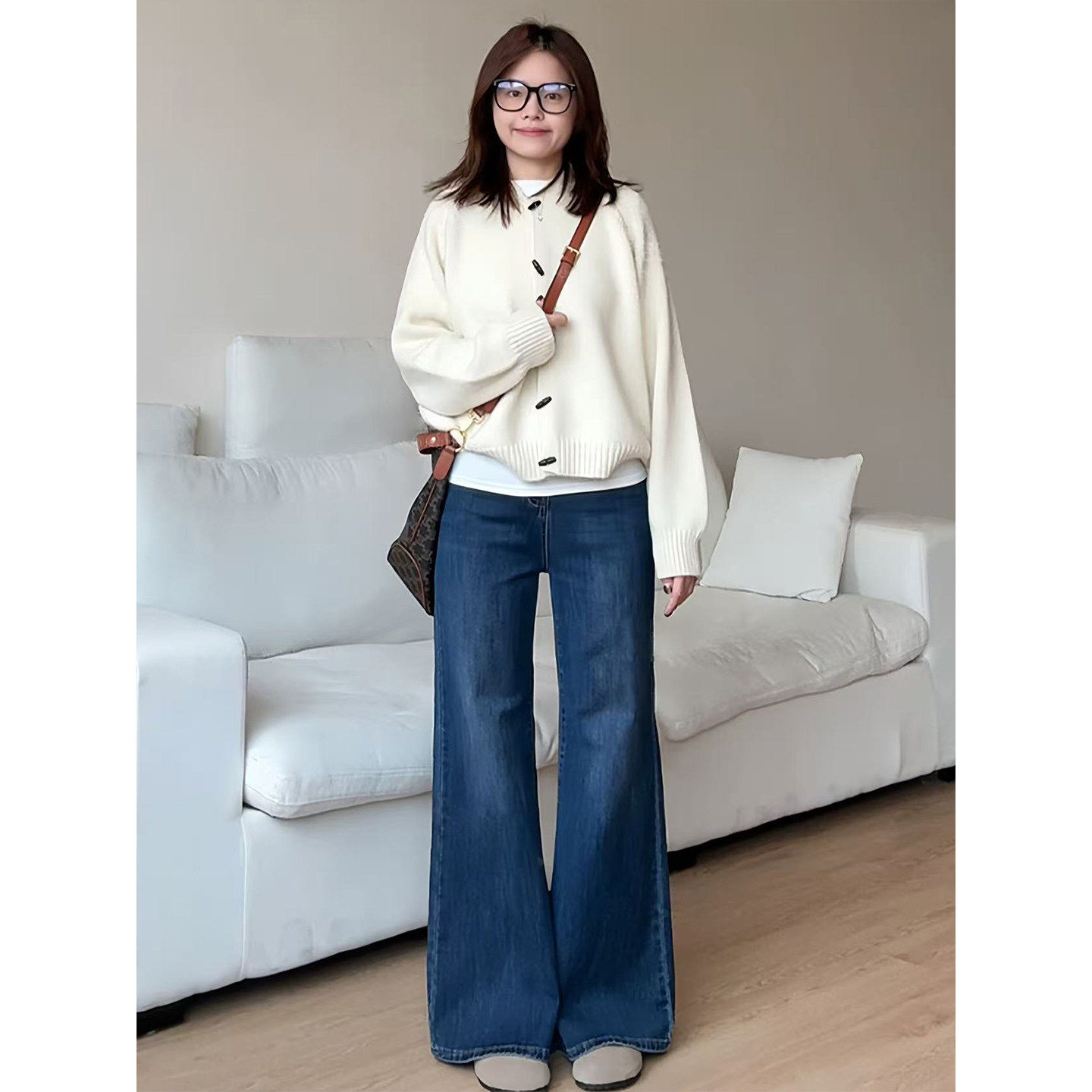 深蓝色不贴腿微喇牛仔裤女2026春夏季新款高腰美式小个子阔腿裤子