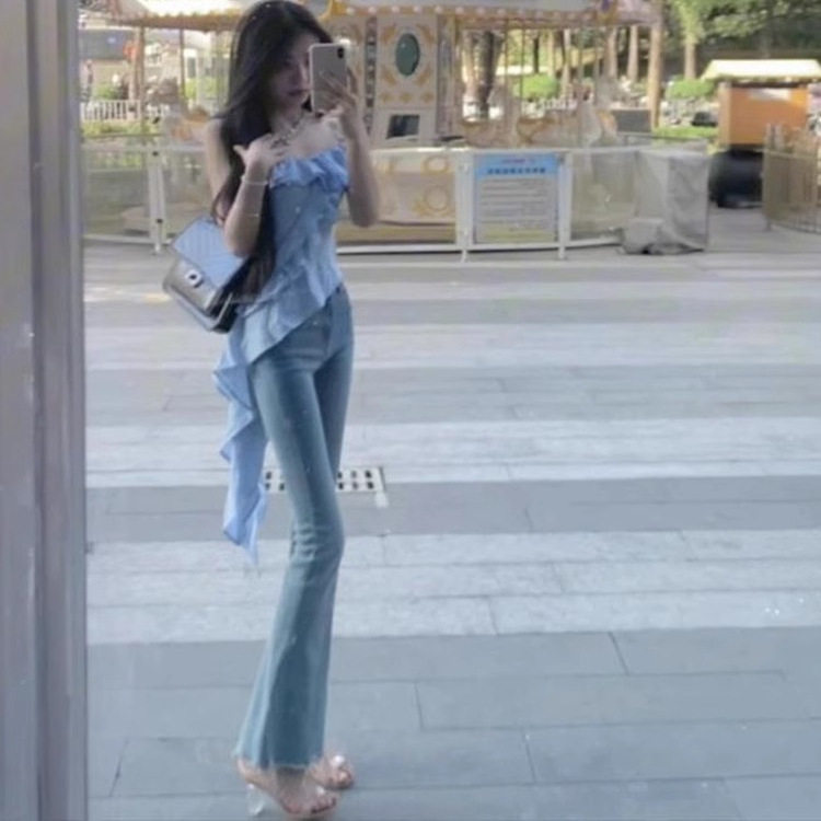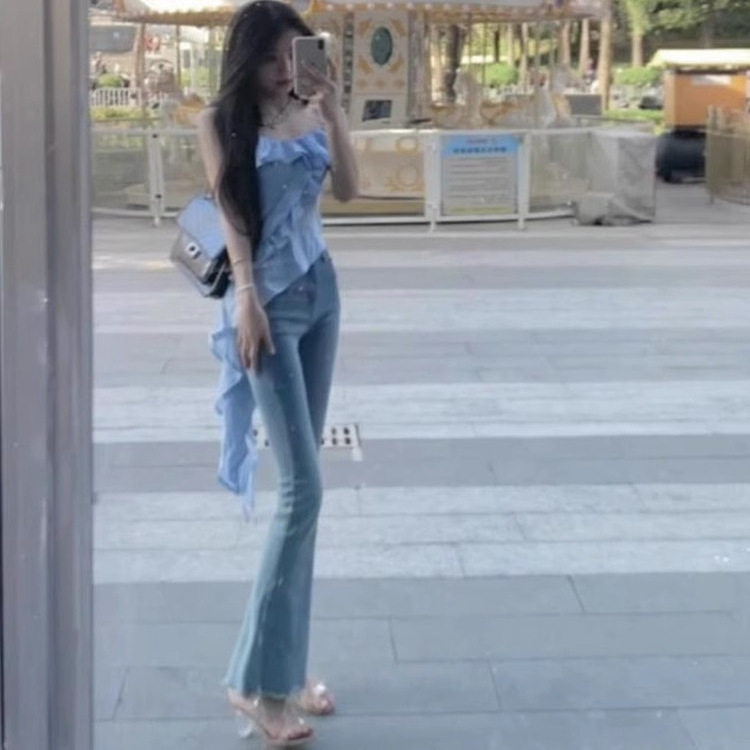 设计感小众荷叶边不规则短款吊带连衣裙喇叭牛仔裤显腿长裤子2025