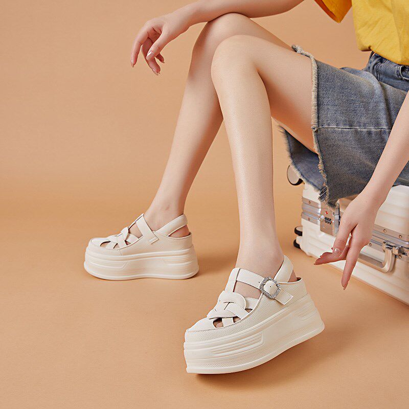 镂空洞洞女鞋小个子2025夏季新款真皮厚底内增高8CM包头运动凉鞋