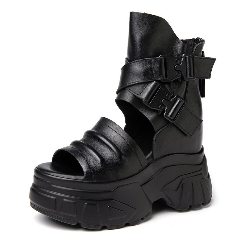 2026夏新款真皮女鞋头层牛皮厚底超高跟鱼嘴凉鞋厚底增高镂空短靴