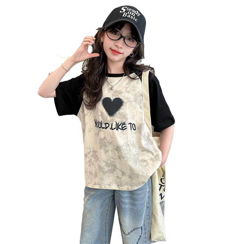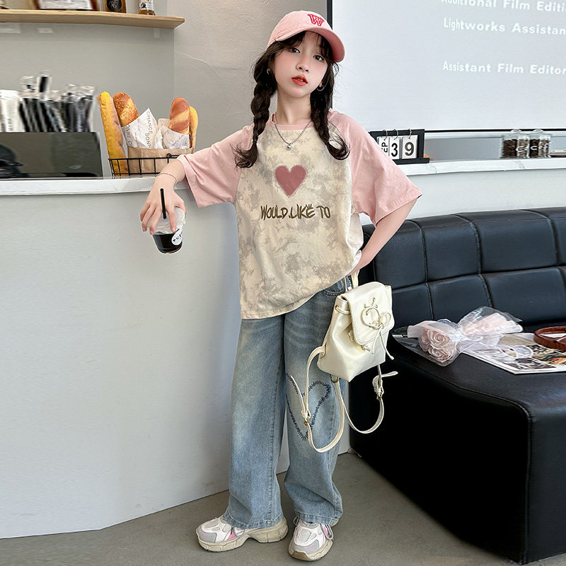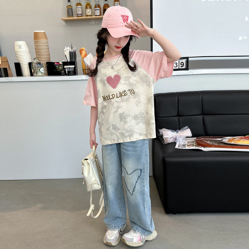 女童夏季套装2026新款洋气大童休闲短袖t恤夏装儿童牛仔裤两件套