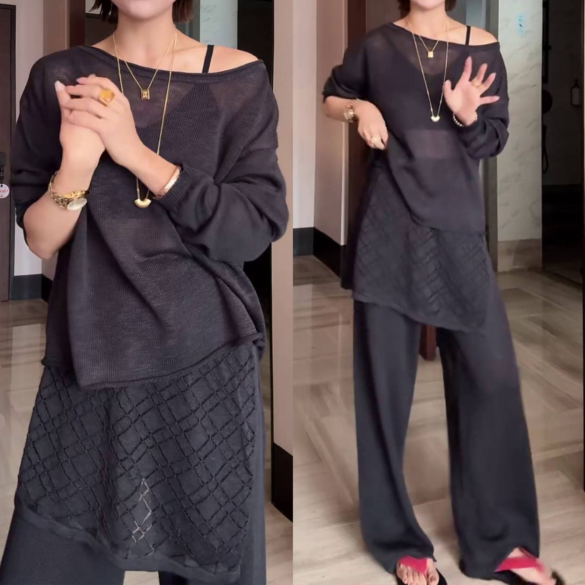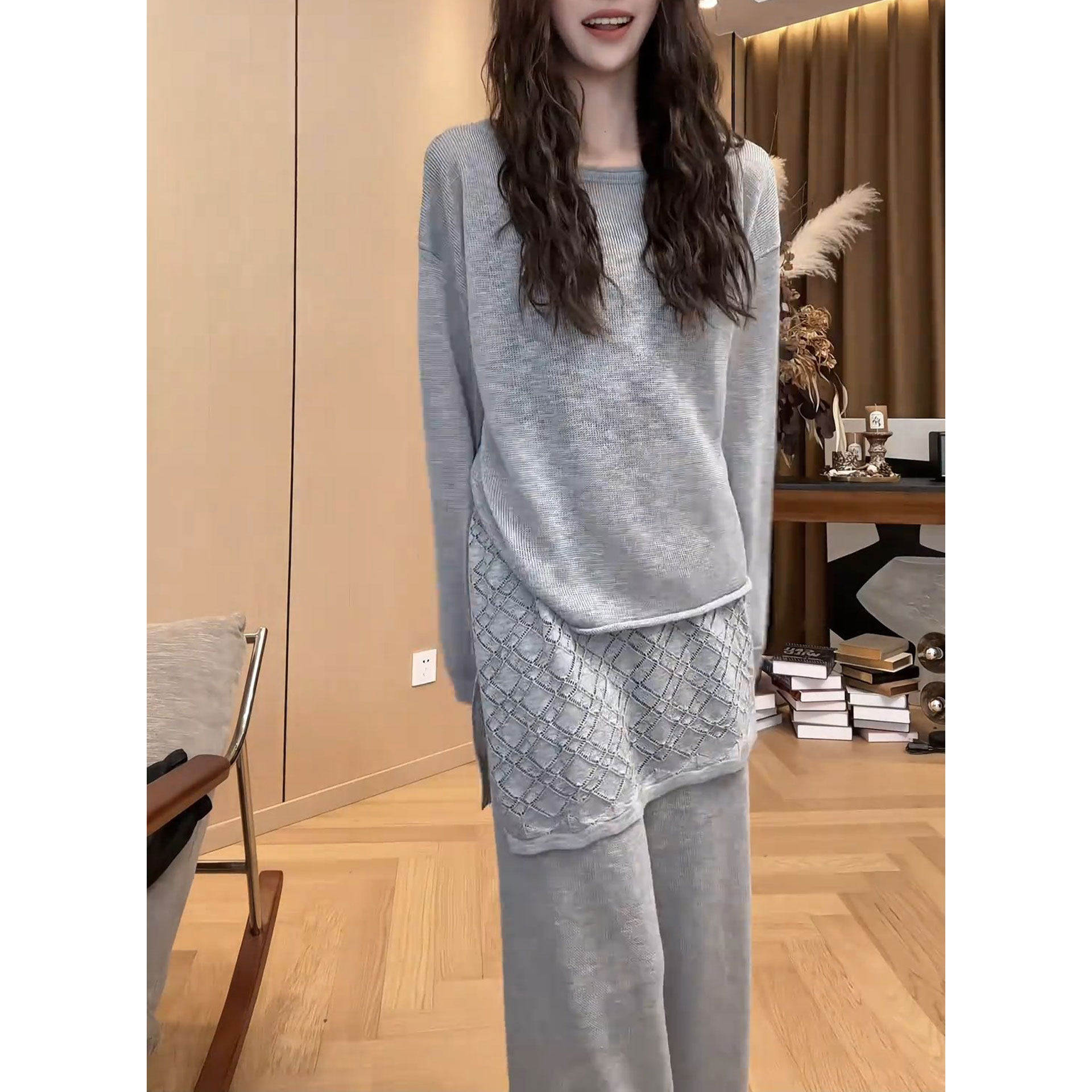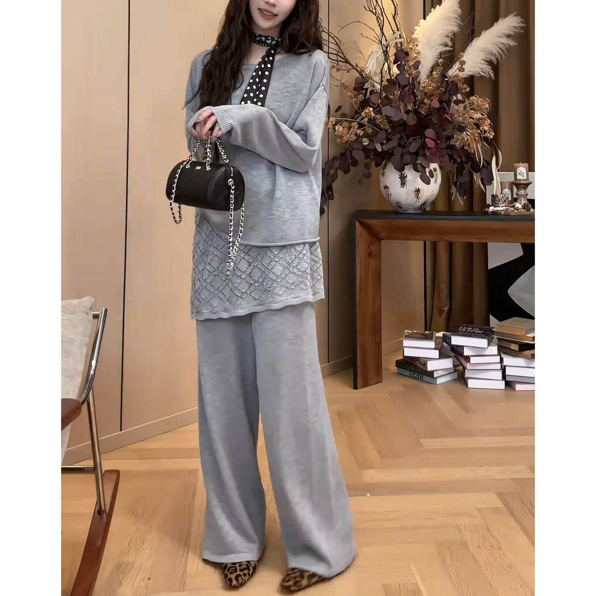 2026早春新款洋气长袖上衣屁帘阔腿裤两件套时尚设计感休闲套装潮